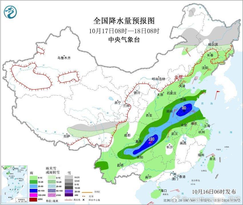 10月17日08时至18日08时,内蒙古东北部、黑龙江中东部、吉林北部、西藏东部、川西高原北部等地部分地区有小雪或雨夹雪。黄淮大部、江淮大部、江汉大部、江南西北部、西南地区东部、云南西南部等地部分地区有中到大雨,其中,山东南部、河南东部、安徽北部、江苏北部、湖北西南部、湖南西北部、重庆东南部、贵州中北部等地部分地区有暴雨或大暴雨(100~120毫米)。