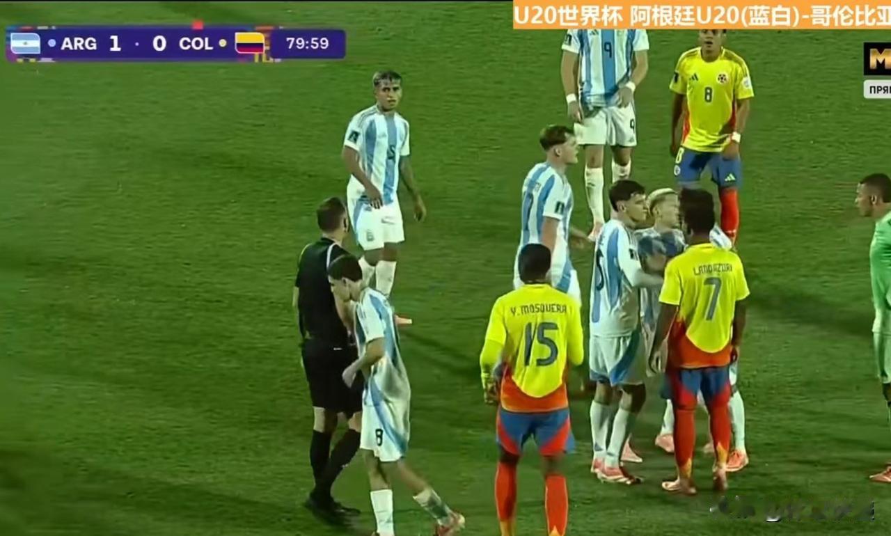 U20世青赛半决赛阿根廷1:0战胜哥伦比亚。本场比赛也是南美球队的对决。上半场双方波澜不惊,下半场72分钟,阿根廷在禁区内觅得机会,西尔维蒂破门,阿根廷取得领先。78分钟,哥伦比亚11号前锋两黄变一红被罚出场,哥伦比亚少打一人。结束前哥伦比亚多次冲击阿根廷球门无果,阿根廷1:0取得胜利,将与摩洛哥争冠。