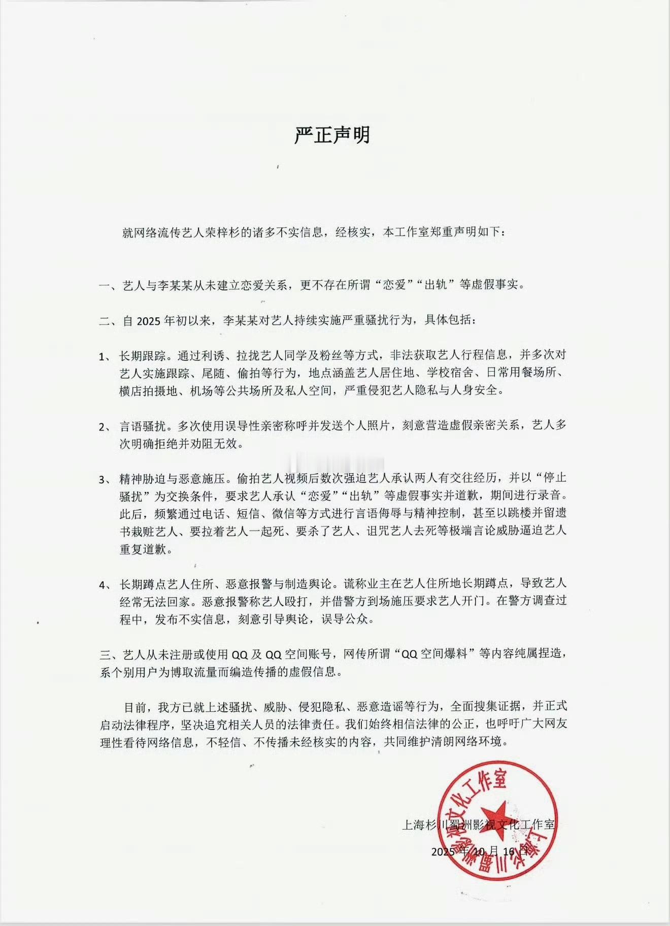 荣梓杉工作室声明说是被李禹熹长期跟踪,骚扰,现在看女方这边会不会继续放料了