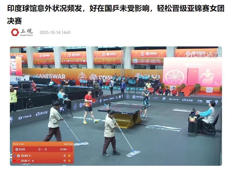 这下印度丢脸丢大了,估计全世界的人都知道了! 10月14日这天,中国选手孙颖莎和韩国选手申裕斌的比赛,最后以孙颖莎3 - 1赢了比赛。可比赛过程中频频出现的意外状况,却比这场胜负还让人揪心。 从现场观众拍的视频和比赛转播能清楚看到,当时正好下雨,可由于场馆顶的防水做得太差,雨水一个劲儿往赛场里渗,地面上到处是水渍。 只要积水影响打球,裁判就得喊停,让保洁员赶紧来擦水。一场比赛下来,居然停了三次,选手们打球的节奏全被打乱了,观众看着也闹心。 事实上,这可不是印度第一次办国际赛事出问题,这些年只要是它承办的大型体育比赛,基础设施差、管理乱糟糟、筹备不仔细这些毛病就没断过,这次漏水只是其中一个小问题而已。 往前追溯到2010年新德里英联邦运动会,那时的乱象更是让人印象深刻。那届比赛印度本来想好好露个脸,结果却成了全球的笑柄。 印度审计署后来查出来,组委会采购的时候贪腐得厉害:一卷只要22卢比的卫生纸,账本上居然写着3751卢比,63亿卢比的建设工程款里,至少有10亿卢比被人私吞了。 更离谱的是,为比赛新建的22个场馆和配套设施,运动会结束还不到一年,就全出了质量问题——高架桥路面裂了缝、停车场的结构都不稳了、体育场看台也漏雨,印度中央监察委员会没办法,只能赶紧组织人抢修。 这种只做表面功夫、不重视实际质量的建设方式,把印度在大型工程监管和质量把控上的漏洞全暴露出来了。 没想到到了今年的乒乓球亚锦赛,印度办赛的本事一点儿没长进,反而问题更多更严重了。 除了孙颖莎比赛的场馆漏水,整个赛事期间乱子不断:比赛的场馆是用田径场临时改的,地胶铺得太晚,运动员只能在硬邦邦的水泥地上热身;女团半决赛的场地里,居然有青蛙跳来跳去,地上还有没清理的鸟屎,卫生条件差得让人没法接受。 后勤保障也一塌糊涂,运动员住的酒店自来水浑得不行,得放20分钟水才能勉强用,有些选手喝了这水还闹肚子,中国队没办法,只能自己带了200箱矿泉水、过滤设备还有药品,跟搬家似的做好保障。 更令人难绷的是,在男子团体半决赛入场的时候,主办方居然放错了旗帜,把英属印度殖民时期的旗子插了上去。这可是涉及到主权的大问题,可组委会就轻描淡写地说是“技术问题”,连句正经的道歉都没有。 而印度这种混乱的赛事管理,甚至直接让它丢了国际赛事的举办资格。 2022年的时候,国际足联因为印度足协受到外部力量不合理干预、严重违反规定,就暂停了它的会员资格,结果原定于当年10月在印度办的U17女子足球世界杯也泡汤了。 此事的根本原因,就是印度足协前主席到期了还不肯退位,最高法院让换届也不执行,最后才被国际足联处罚。这种内部管理一团糟的情况,就算印度拿到了国际赛事的承办权,也没法按照国际标准把筹备工作做好。 从2010年英联邦运动会的贪腐丑闻,到这次亚锦赛的各种乱象,再到之前U17世界杯被取消资格,印度办大型国际赛事时暴露的问题其实都差不多:只想着申办下来撑面子,却不认真筹备;只注重表面样子,不抓实际质量;既没有专业的赛事运营团队,也没有严格的监管办法。 体育赛事的核心是给运动员提供公平比赛的地方,给观众看精彩的比赛,可印度总把国际赛事办成“闹剧”,不仅坑了参赛选手,也让国际体坛越来越不信任它。 要是印度还不重视这些问题,不从基础设施、专业人才、监管体系这些根本上改进,以后怕是很难再拿到大型国际赛事的承办权了。
