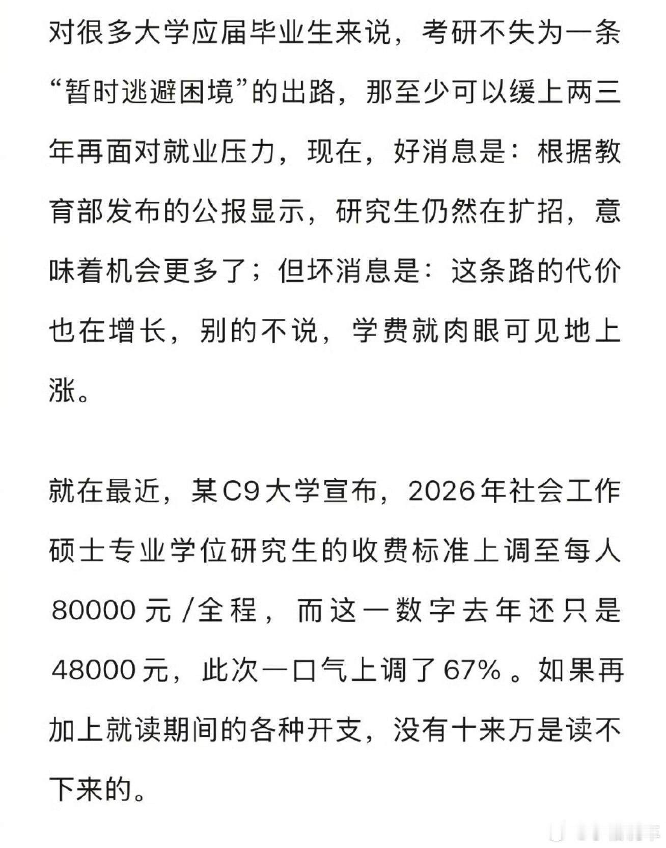 研究生学费暴涨你还会选择读研吗真的好贵啊,有些学校从8000/年上涨到了25000/年,有的些学校看着不涨,但总额却很多,就比如东华大学国际商务专硕的学费到了21.8万 像如果已经决定好了,肯定要把该花的钱算明白,能接受的就读,不能接受就不读
