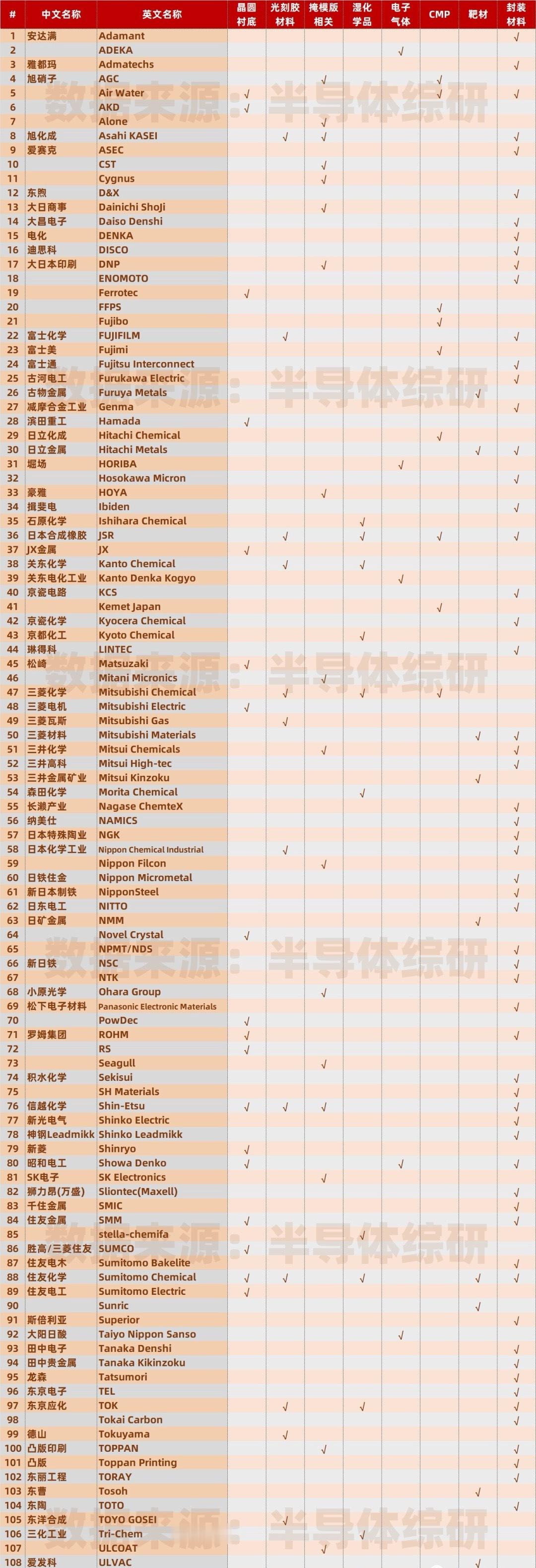 你看,日本信越的半导体硅片、JSR的光刻胶、Disco的晶圆切割设备,全是全球第一或垄断级的,在业内就是标杆。