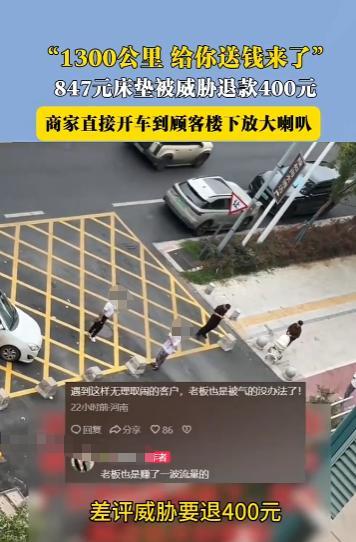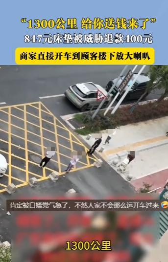 “这下后悔了吧!”10月14日,安徽芜湖,一男子购买847元床垫威胁商家退款400元,商家气不过,直接从广东佛山开车1300公里来到男子家楼下放大喇叭,称自己来送钱了!网友:这真是咎由自取! 总有人网购想占便宜,明明商品没有任何问题,还变着法儿的找理由退款,有些甚至更过分,想仅退款白嫖商品,这么做可要考虑好后果,有些商家可不是软柿子。 一男子网购了一张847元的床垫,到货后,他感觉床垫的价格有点贵,可床垫完好无损,男子没能找到售后的理由,索性直接用差评威胁商家给他退400元。 商家遇到这样无理取闹的顾客也是气得够呛,思来想去,商家一咬牙,驱车1300公里从广东佛山直接开到了安徽芜湖,来到男子家楼下。 只见商家在男子家楼下用大喇叭循环播放男子的“光荣”事迹,将其恶意威胁退款的事情一股脑全说了出来,表示自己专程开车来给他送钱。 听到这么狗血的事情,不少住户都探出头看热闹,其中一户不知是不是男子家,喊“再放报警了”,这么丢人估计男子也不敢下楼了。 不少网友觉得商家肯定是气得够呛才出此下策,毕竟1300公里的油费和高速费已经远远超过400元,男子这就是咎由自取! 信息来源:《847元床垫被威胁退款400元 商家直接开车到顾客楼下》大象新闻