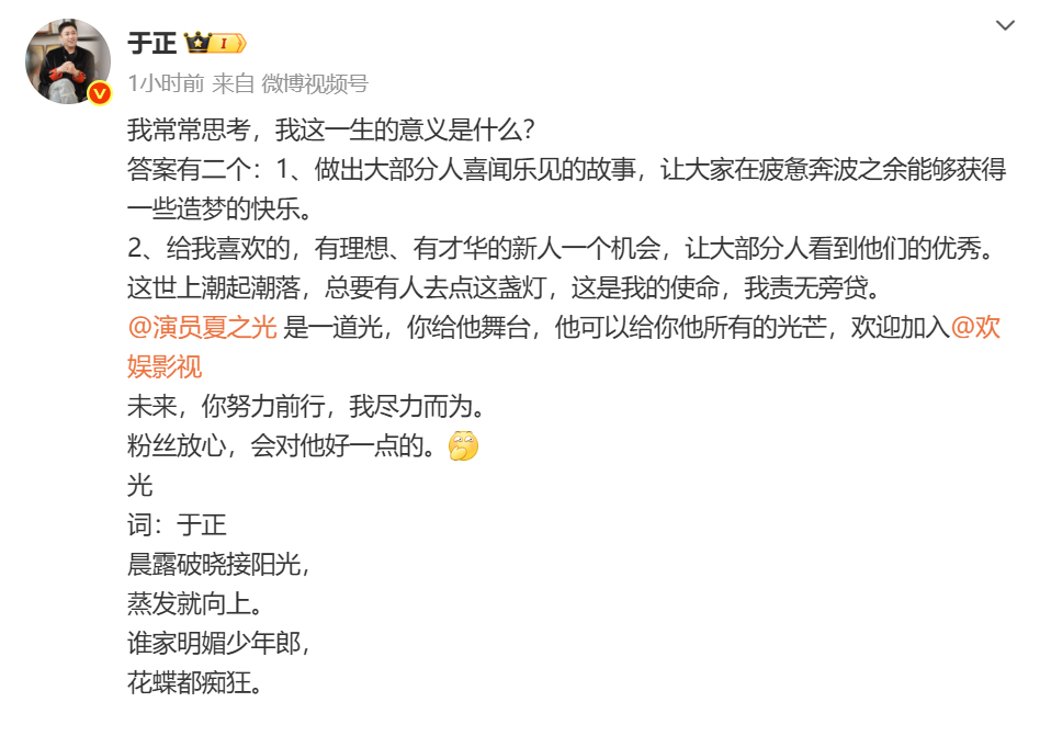 夏之光真的签了欢娱影视!于正还发长文说会对夏之光好一点,期待了[哇]