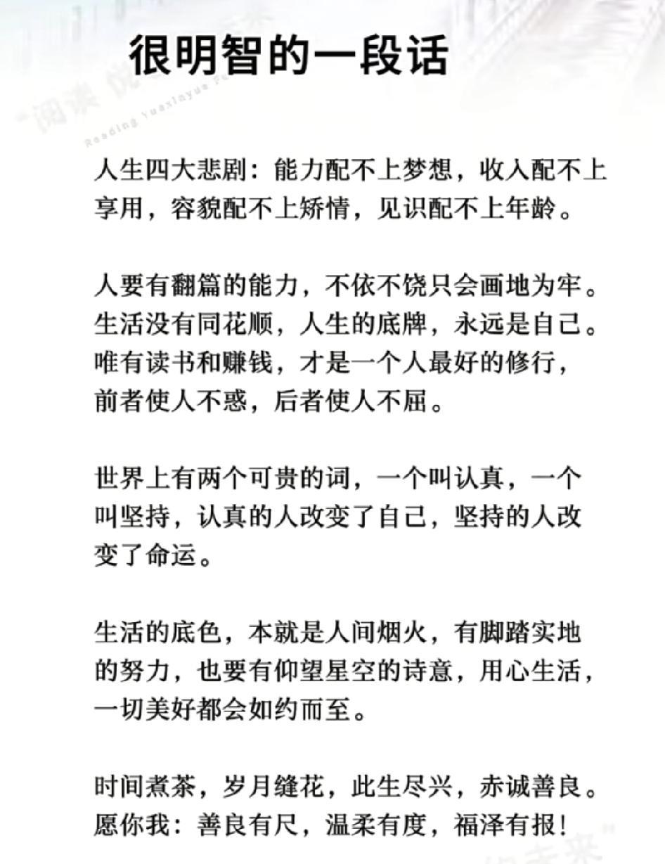 人生四大悲剧:梦想配不上能力,收入配不上享受,容貌配不上矫情,见识配不上年龄。