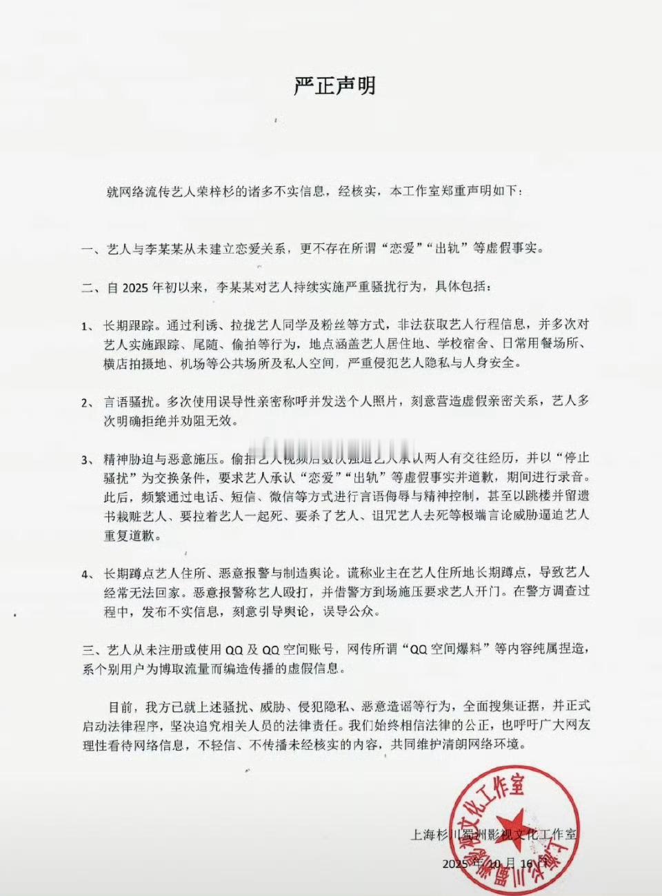 荣梓杉工作室发声明说李禹熹长期骚扰荣梓杉,逼荣梓杉承认交往。。。