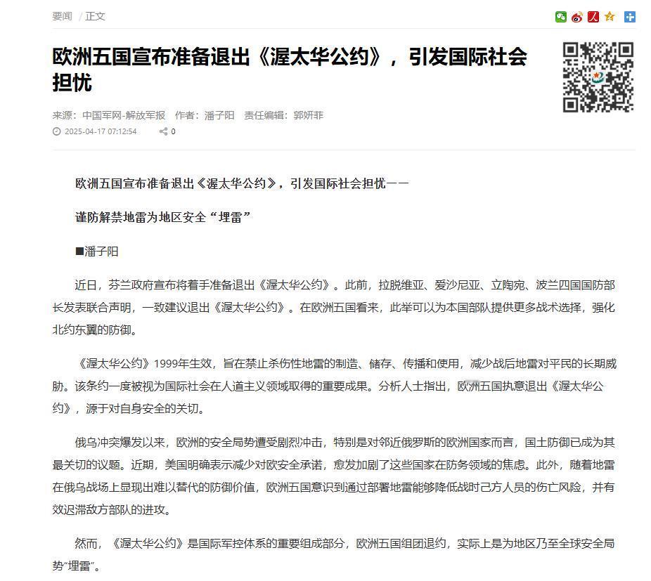 立陶宛退出!拉脱维亚退出!爱沙尼亚退出!波兰和芬兰也退出!挨着俄罗斯的国家集体搞了个大动作,直接宣布要退出《渥太华禁雷公约》。 这个公约可是 1999 年生效的重要国际协议,专门禁止杀伤人员地雷,到现在已经有 164 个缔约国了,如今却被俄罗斯周边这几个国家集体 “甩在身后”。 为啥? 事情的导火索要从2025年3月说起。 当时波兰、立陶宛、拉脱维亚和爱沙尼亚四国防长就一起发了声明,说打算退出《渥太华禁雷公约》,理由是“现在安全环境太不稳定”,还有“俄罗斯带来的持续威胁”。 紧接着到了7月,芬兰也正式通知联合国,说2026年1月起就不再履行公约义务了,就连乌克兰也跟着在7月15日宣布暂停履行公约里的义务。 这一连串动作显然不是巧合,立陶宛外长布德里斯就透露过,这五个国家早就针对退约的事“密集讨论过”,而且都觉得这么做是“保卫国家、人民还有北约每一寸领土”的必要办法。 波兰甚至已经计划要生产100万枚杀伤人员地雷,而立陶宛也专门预留了8亿欧元的专款,就用来生产地雷。 看得出来,这些国家的目标很明确:就是想通过恢复使用地雷,来加强北约东翼的防御,尤其是为了应对俄罗斯可能采取的军事行动。 这些国家密集退约的背后,核心原因其实藏在对俄罗斯军事威胁的深层担忧里。 自从俄乌冲突爆发后,欧洲的安全环境就发生了根本性的变化。 俄罗斯本身就没加入《渥太华禁雷公约》,还在战场上大规模使用地雷,这让周边这些国家明显感觉到“自己处在不对称的劣势里”。 乌克兰总统泽连斯基就直言,俄罗斯不受公约限制,可乌克兰的防御手段却被绑住了手脚,这也是乌克兰决定退约的重要原因。 更让东欧这些国家不安的是,俄罗斯已经在加里宁格勒和白俄罗斯部署了像TOS-1A温压火箭系统这样的先进武器,这些武器能快速清除雷场,这无疑让边境的紧张局势又升级了不少。 在北约东翼的这些国家看来,地雷是“成本最低、效果又最直接”的防御手段,芬兰国防部长安蒂·哈卡宁研究过俄乌战场的情况后就得出结论:地雷是“成本效益最高的防御武器”,能有效拖延敌方的进攻速度。 除此之外,美国对欧洲安全承诺逐渐减少的趋势,也让这些国家心里越来越焦虑,在这种情况下,它们才选择“自己主动加强防御”,想靠着地雷在边境构建起一道“钢铁防线”。 可这一连串退约决定,很快在国际社会掀起了不小的争议。 联合国人权高专办和红十字国际委员会都明确表示“非常担忧”,还指出地雷会对平民造成长期伤害,而且排雷的成本特别高——每平方公里的排雷费用就需要30万到100万美元。 有数据显示,全球每年因地雷伤亡的人数超过5700人,其中84%是平民,儿童占比更是接近40%。 更严重的是,这种退约行为可能会引发“多米诺骨牌效应”,要是有更多国家跟着效仿,《渥太华公约》的权威性就会被严重削弱,地雷的使用说不定会再次泛滥。 俄罗斯这边也已经暗示过,会采取“对等反制”措施,这很可能让欧洲陷入新一轮的军备竞赛里。 另外,退约这事还暴露了北约内部的裂痕,德国、法国、意大利这些西欧国家还在坚守公约,反对使用地雷,可东欧国家却觉得这是关乎“生存的问题”,这种分歧很可能会削弱北约的凝聚力,让欧洲在应对俄罗斯的时候难以形成统一的立场。 其实五国退约这件事,更像一面镜子,照出了当下欧洲安全格局的深层困境——靠地雷构建的“防线”,终究解决不了根本问题。 相反,这种做法可能会加剧双方的不信任,让冲突升级的风险变得更高。 就像联合国秘书长古特雷斯警告的那样,退约很可能会摧毁二十多年来国际社会在禁雷上付出的努力。 真正的出路,其实在于通过多边对话重新建立互信。 中国一直都主张通过和平谈判解决争端,也倡导在联合国框架下构建均衡、有效、可持续的安全架构。 对欧洲来说,接下来怎么在防御需求和人道主义原则之间找到平衡,怎么通过外交手段缓解和俄罗斯的紧张关系,会是未来要面对的重大挑战。 说到底,五国退约这件事,算是欧洲安全格局的一个重要转折点。 它既反映出俄罗斯的军事压力对周边国家造成的影响,也暴露了国际军控体系的脆弱性。 在这个充满不确定性的时代,怎么避免“以暴制暴”的恶性循环,怎么通过合作而不是对抗来解决争端,这是摆在所有国家面前的共同课题。 对于这件事,你有什么看法呢?欢迎在评论区留言,咱们一起讨论讨论。