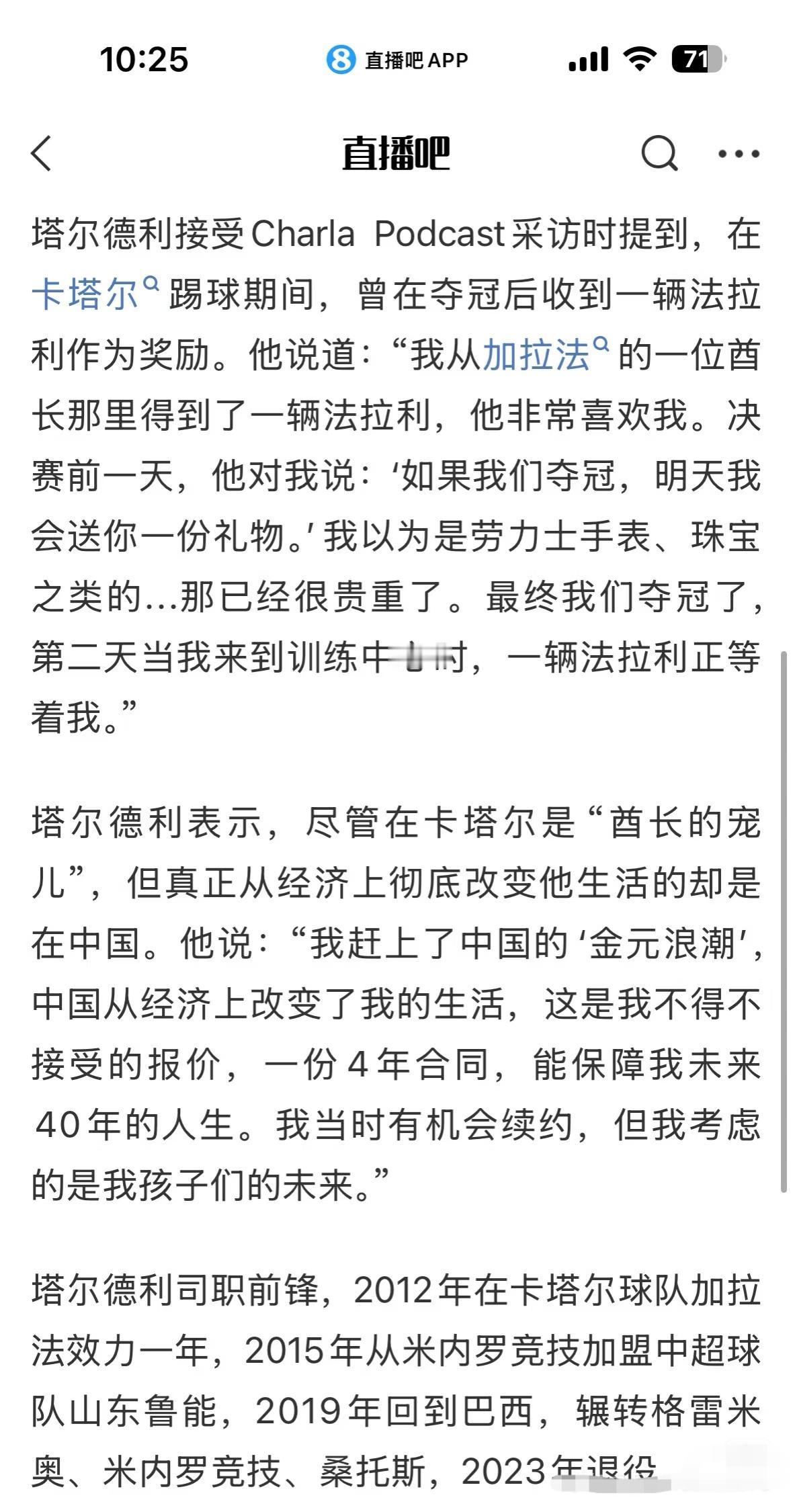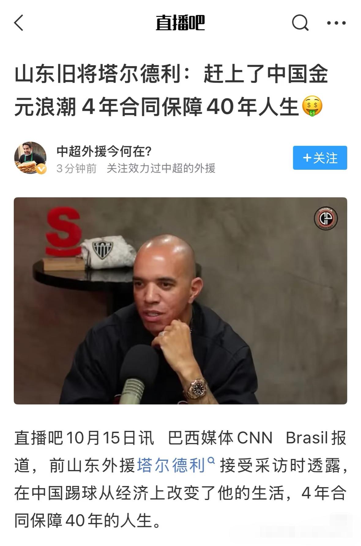 塔尔德利:在中超4年合同保障40年人生!