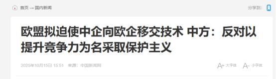 要求中国强制转移技术,美媒曝出惊人消息! 10 月 15 号这天,美国彭博社扔出个大新闻。新闻里说,欧盟正在偷偷搞一项 “技术转让令”,所有想在欧盟做生意的中国企业,都得把核心技术共享给欧洲公司,要是不照做,就别想进欧盟市场。 有知情人透底,欧盟把这政策叫 “给产业竞争力打强心针”,最快 11 月就能落地,首当其冲的就是电池、半导体、新能源这些关键行业。这消息一爆出来,中欧之间的贸易氛围瞬间就紧张了。 欧盟为啥突然对中国企业 “亮刀子”? 表面上看,欧盟喊的是 “技术自主” 的口号。 这两年中国企业在欧洲清洁能源领域投钱跟撒胡椒面似的:宁德时代在匈牙利盖了电池厂,远景能源往西班牙的风电项目砸了不少钱,比亚迪还打算在德国扩产造电动车。 这些项目虽说带动了当地不少人就业,可欧盟却越看越焦虑,他们发现,本土企业在技术上一直跟在中国企业后面跑。 欧洲运输与环境联合会出了份报告,里面直截了当说:要是不逼着中国企业转让技术,欧洲早晚得变成中国电池制造商的 “组装车间”。 往深了说,其实是欧盟怕自己的产业 “空心化”。有数据摆在那儿:欧盟在全球电池产能里占的份额连 10% 都不到,反观中国,直接占了 70% 往上。 去年欧洲自己搞了 16 个电池工厂项目,结果 12 个因为技术卡壳被迫推迟;再看中国企业在欧洲的 13 个项目,10 个都按原计划推进了。 这么大的差距让欧盟坐不住了 —— 要知道,绿色技术是欧盟实现碳中和目标的关键筹码,要是被中国在这方面 “卡脖子”,他们在全球气候议题上的话语权就得大打折扣。 中国企业这是成了欧盟眼里的 “唐僧肉”? 欧盟这会儿拿出来的初步方案里,要中国企业交技术有俩路子。 一是中国企业想拿欧盟的补贴,就得把详细的技术共享计划交上去;二是想进欧盟市场,得满足 “技术本地化率” 的门槛,比如说产品里欧洲自己研发的技术含量,最少得占 30%。 这种明着要好处的做法,中国外交部直接批成 “披着合法外衣的技术掠夺”。 中国企业早就闻出不对劲了。今年 3 月的时候,比亚迪管欧洲事务的负责人阿尔塔维拉就明着说,要是欧盟真逼着转让技术,比亚迪就得重新琢磨在德国建厂的事儿。 还有宁德时代跟斯特兰蒂斯的合作项目,虽说拿到了西班牙政府 3 亿欧元的补贴,可就因为没加技术转让的条款,被欧盟官员点名说 “没诚意”。 更讽刺的是,欧盟一边逼着中国企业 “无私奉献”,一边把自己的技术捂得严严实实 —— 德国大众跟国轩高科合开的工厂,到现在都没把核心技术反向输出给中方。 面对欧盟这波 “霸王操作”,中国这边也没闲着,反制措施悄悄就铺开了。 10 月 9 号,中国商务部发了通知,要对稀土相关技术搞出口管制,明明白白说清楚:境外企业要是想用中国的稀土技术,必须先拿到中方的许可。 这招 “用对方的办法怼回去” 正好戳中欧盟的痛处 —— 欧洲新能源产业对稀土的依赖度高达 90%,而全球 70% 的稀土加工产能都攥在中国手里。 在国际上说话的场合,中国也主动发声了。外交部发言人林剑连着三天在记者会上强调:“技术合作得基于双方自愿和市场规则,逼着转让技术根本不符合世贸组织的精神。” 欧盟这套 “技术转让令” 其实根本不是铁板一块。德国经济部就明着反对把范围扩到汽车行业,怕这么干会把中国这个最大的单一市场惹毛了; 法国却一个劲要强硬,甚至提议把技术转让写进欧盟跟中国所有的贸易协议里。 这种分歧在欧洲议会里更明显:左翼党团骂这政策是 “开历史倒车”,右翼议员却急着喊 “再不动手就晚了”。 更有意思的是美国的态度。白宫虽然没公开说啥,但彭博社扒出来,特朗普政府在暗地里给欧盟施压,要欧盟在技术管制上跟美国 “对齐”。 这种外面来的干预让欧盟两头为难:要是完全跟着美国走,可能就丢了中国这个大市场;要是想自己拿主意,又怕美国在半导体这些领域反过来 “卡自己脖子”。 不管最后条款是啥样,这套政策肯定会把中欧经贸关系改头换面。 对中国企业来说,得在保住技术秘密和留住市场份额之间选,这活儿难办:要么像国轩高科那样,靠合资公司搞点 “有限度的技术输出”;要么学远景能源,转头去东欧那些监管松点的地方投资。 可欧盟的 “小算盘” 也未必能打响 —— 专门研究锂电池供应链的 SC Insights 机构就提醒,逼中国企业转让技术,可能会让中国企业减少研发投入,最后反过来坑了欧洲的长期利益。 欧盟想靠行政手段拧过市场规律,可它要面对的不只是中国的反制,还得给自己喊的 “开放市场” 口号兜底。 11 月的日子越来越近了,中欧关系下一步是一起赚钱,还是各走各的?答案说不定就藏在布鲁塞尔那些让人看不懂的法律条文里。