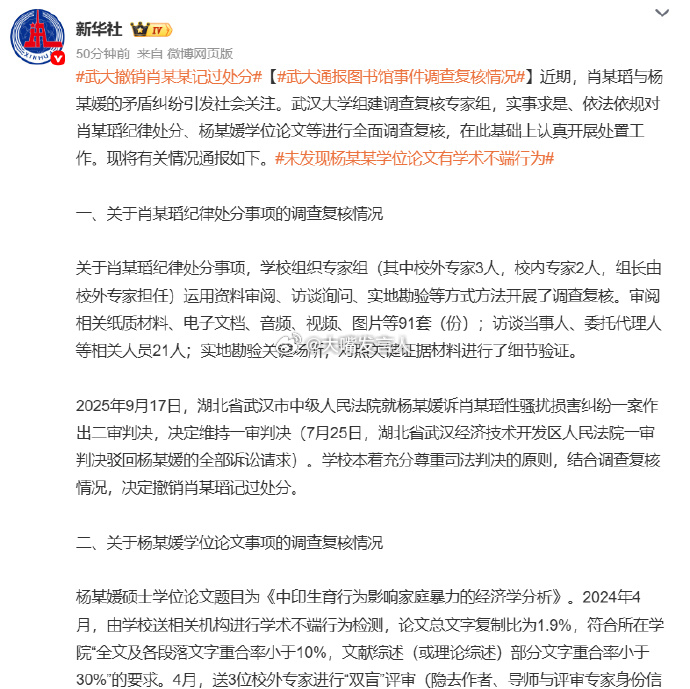 武大撤销肖某某记过处分,热点观点