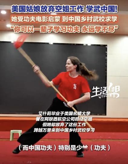 最近有件超酷的事儿,美国金发碧眼的姑娘艾什莉辞去了空姐工作,来到中国追寻她的功夫