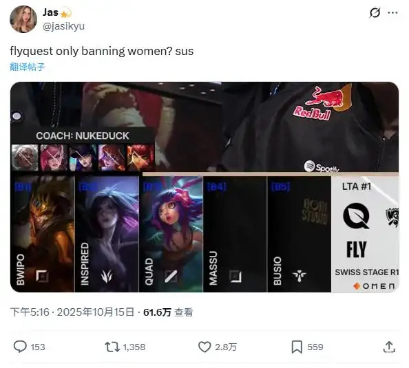 昨天FLY对战T1的比赛,推特COS博主质疑FLY只ban女性英雄…