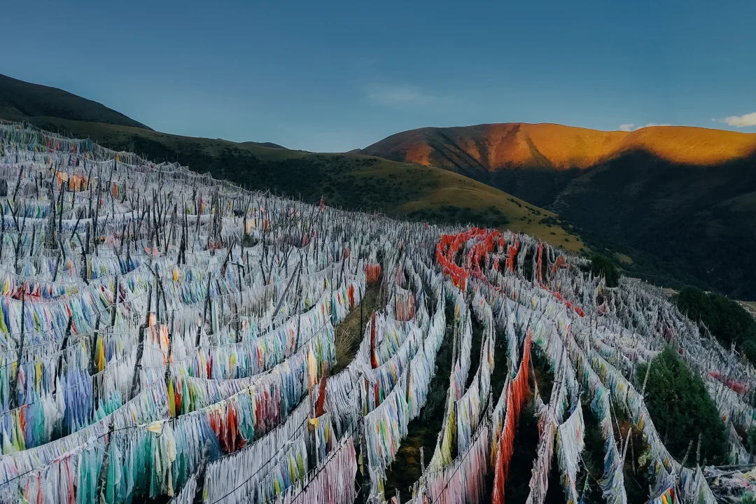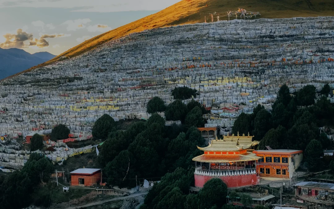 4,寺院。山顶还有一座隐秘的,地图上都搜不到名字的寺院,但有着川西独一无二像迷宫般的经幡阵,航拍无敌。
