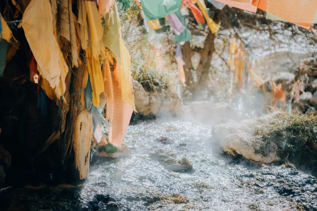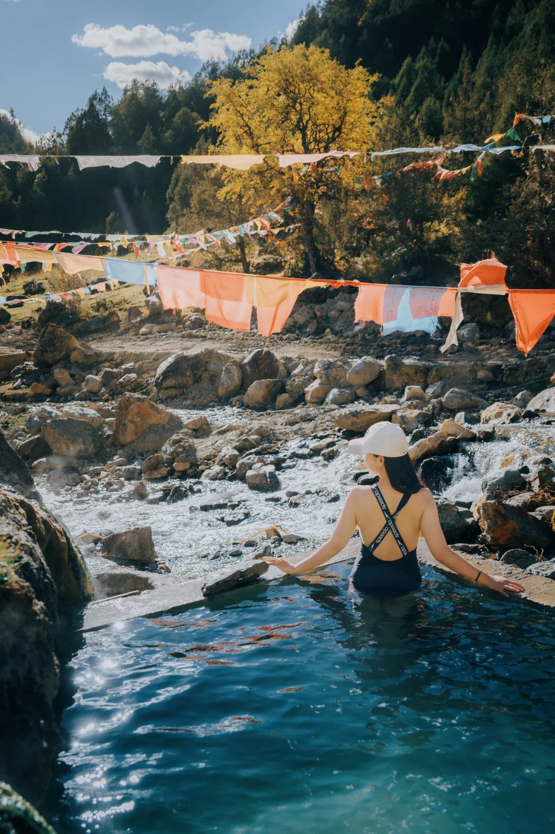 1,温泉。这是天然硫磺野温泉,泉眼能煮熟鸡蛋,然后热水引导在小溪边的几个池子。温泉上面有经幡飘扬,不远处就是金色的彩林,简直梦幻。