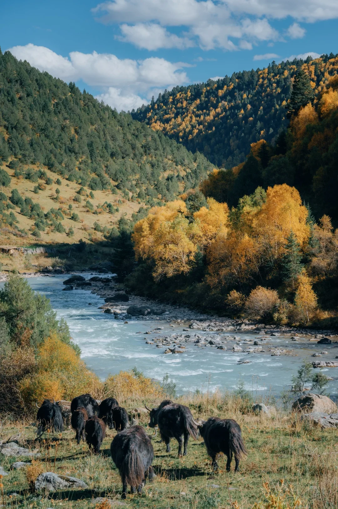 3,牧场。这边的牧场质量超级高,不像川西很多地方的草比较秃。这个季节,牧场里面开满了蓝色的龙胆花,牧场正对面就是成片的彩林,太美我都说累了,阿尔卑斯即视感。