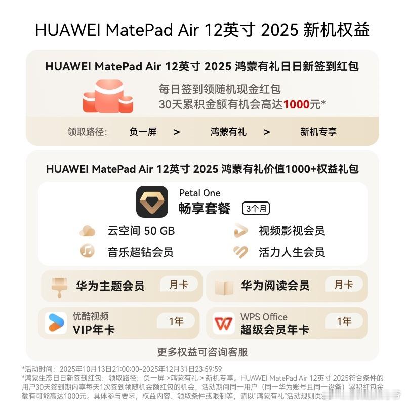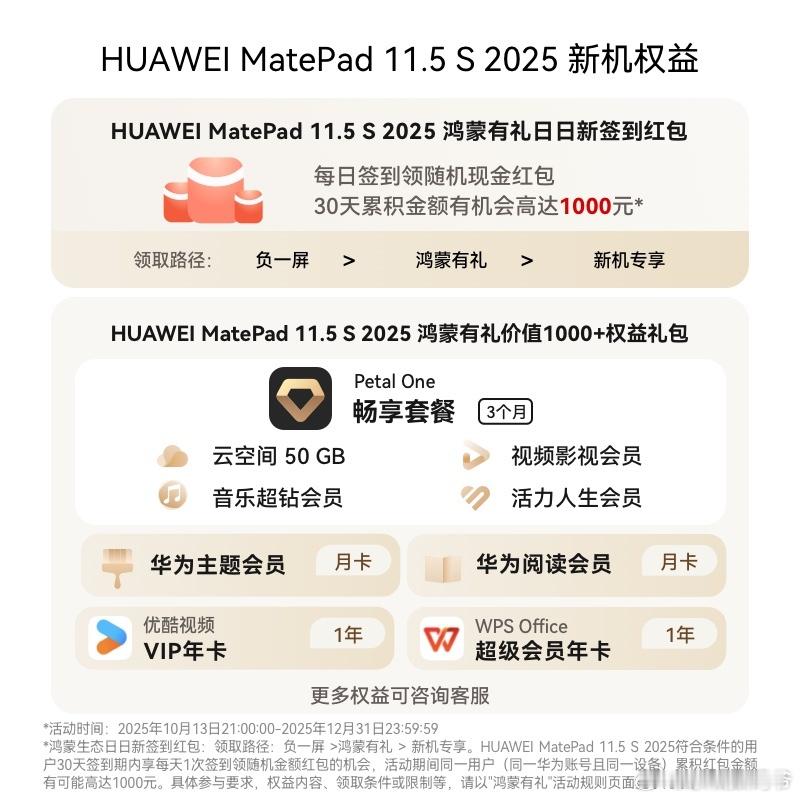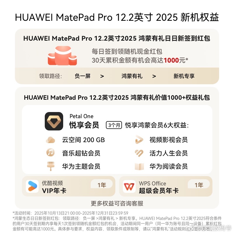可在平板桌面右滑负一屏,点击鸿蒙有礼-新机专享可参与华为平板鸿蒙有礼日日新活动,每日签到可领取随机金额红包1个和随机权益1个,最多可累计签到30次,累计金额有机会高达1000元~
