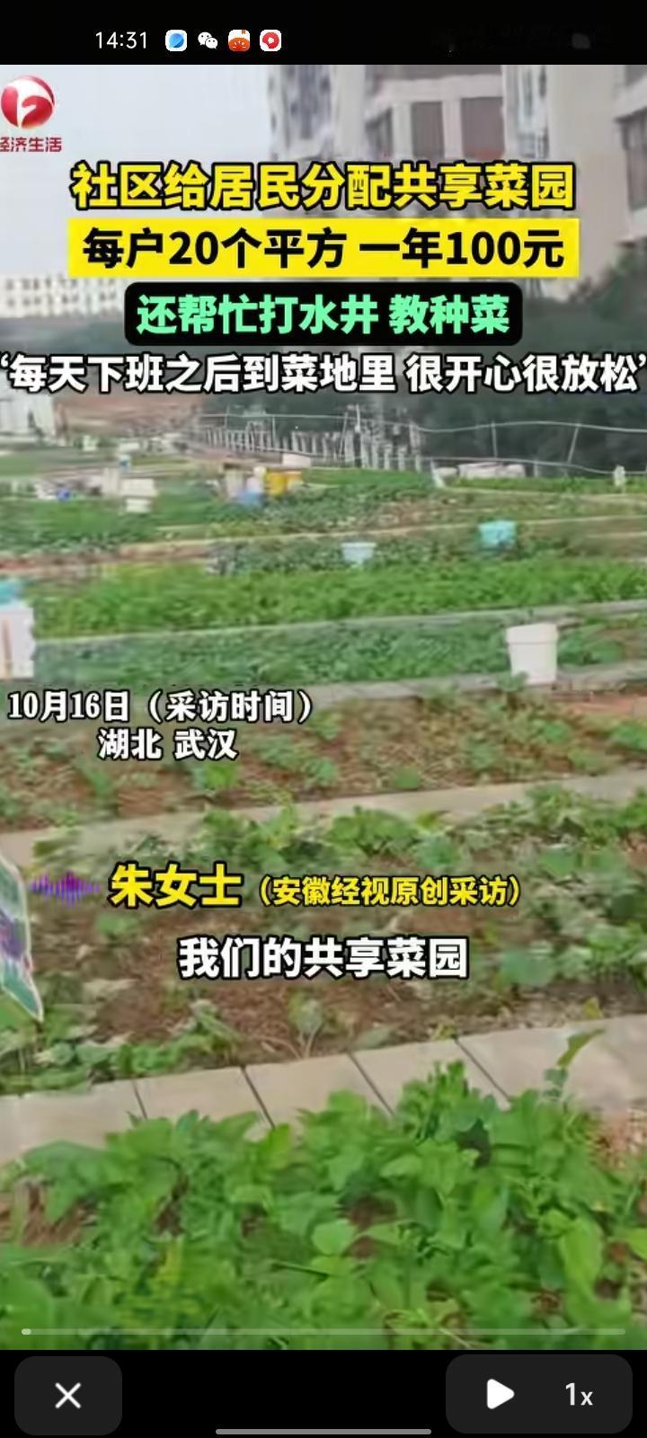 10月15日,湖北武汉。女子晒视频称,社区居委会分配共享菜园,每户20平,一年100元。不仅如此,居委会不仅给大家打水井,还专门请农业大学志愿者来教大家如何种菜、施肥、除虫。自己种的菜吃的安心,在菜地里和邻居聊天,像一个和谐的大家庭,很开心又很放松。