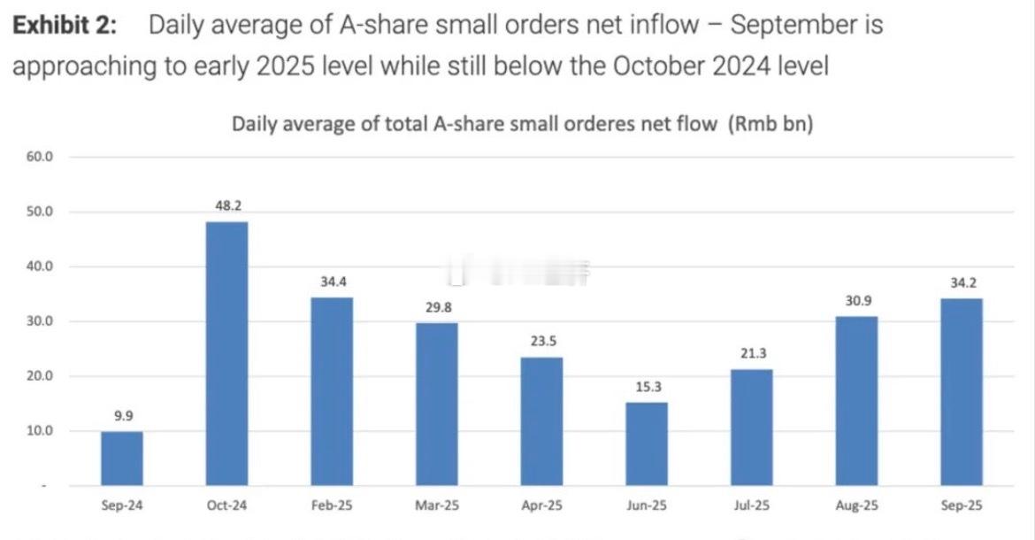 A股市场的散户资金正呈现回流趋势,其9月份日均小额订单净流入已回升至342亿元,接近2025年初的水平,但仍低于2024年10月的峰值。