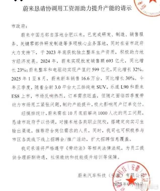 “蔚来需在10月底前解决1000人次的用工问题”。