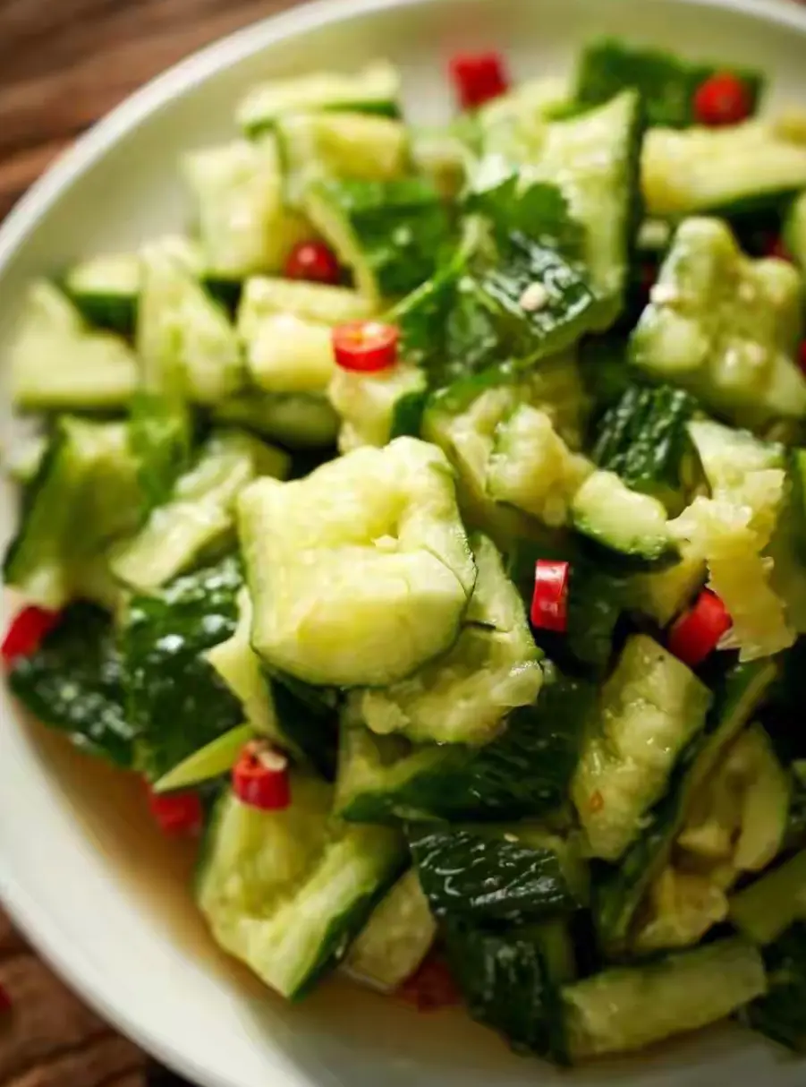 饭店的凉拌黄瓜总比家里做的香,其实不是调料多复杂,而是藏着几个容易被忽略的小细节。学会这几步,在家也能做出脆爽入味、和饭店一模一样的凉拌黄瓜,新手看一遍就能会。 先准备食材:5 根黄瓜、1 大勺普通面粉、2 勺食盐(分两次用)、1 大勺白糖、适量小米辣、大蒜、小葱、白芝麻、花椒粉、食用油、1 碗花生米、4 勺生抽、3 勺香醋、1 勺素蚝油、2 勺香油、1 勺辣椒油。 具体做法很简单,关键步骤别漏掉: 洗黄瓜时加面粉和 1 勺盐,浸泡 2 分钟再冲洗。面粉能吸附表面杂质,盐能杀菌,比直接冲更干净。 黄瓜切去头尾(减少苦味),装保鲜袋用擀面杖敲 1 分钟再切斜刀块。敲打能破坏黄瓜纤维,后续更入味。 切好的黄瓜加 1 勺盐和 1 勺白糖,拌匀腌制 10 分钟。提前腌出水分,既能入底味,又能让黄瓜更脆。 小米辣切圈、大蒜剁末、小葱切葱花,和白芝麻、花椒粉一起放进碗里,浇上烧冒烟的热油爆香,香味立刻就出来了。 用剩下的油小火炒花生米,听到 “噼啪” 声就盛出,避免炒糊,放凉后更脆。 往爆香的调料碗里加 4 勺生抽、3 勺香醋、1 勺素蚝油、2 勺香油、1 勺辣椒油,拌匀调成料汁。 黄瓜腌好后用纱布挤干水分,这一步是脆嫩的关键,千万别省。 挤干的黄瓜、炒好的花生米和料汁放一起,多拌几下让每块黄瓜都裹上料汁,吃不完的放冰箱冷藏,口感更绝。 这样做的凉拌黄瓜,脆爽不软塌,香味能飘满厨房,每次端上桌都被抢着吃。你们在家做凉拌黄瓜时,是不是没试过用擀面杖敲或者挤干水分?赶紧试试这两个秘诀吧!