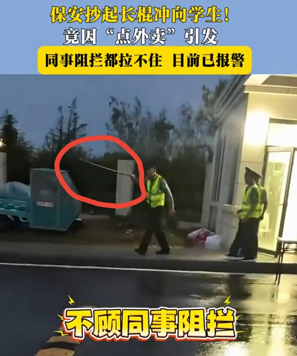 离谱!三天两起,又一个保安因学生点外卖而做出冲动的举动。 今天杭州某学校门口保安,因学生点外卖,手持长棍冲向学生,他同事拦都拦不住,性质有点恶劣。 视频中可见,保安离学生还有一段距离就把长棍扔了出去,疑似那学生一点不怂,拍着脑袋挑衅,说:“来,往这打。” 周边的人见状,立马有人喊打电话报警。无独有偶,10月14日,海南某学校门口保安,扔掉学生点的外卖并撕掉标签,校方出通报回应了,是因外卖员多次不听保安的指引,没有把外卖放在指定的地方。 相对来说,杭州这个保安就有点虎,不管学校有没有规定学生不准点外卖,但对学生动用武力,暴力行为肯定不对。 学校不给学生点外卖,是怕食品安全问题,万一吃出事要担责的。作为学校保安,劝导为主,控制不住情绪暴力输入,只怕饭碗是保不住! 保安行为 学校保安