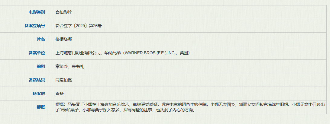 最好的我们导演新作立项据国家电影局关于2025年9月上全国电影剧本(梗概)备案、立项公示的通知,合拍影片《格根塔娜》备案立项,由上海随意门影业有限公司、华纳兄弟备案,章笛沙(《群星闪耀时》《最好的我们》)、朱书礼(《恩爱两不疑》)编剧。