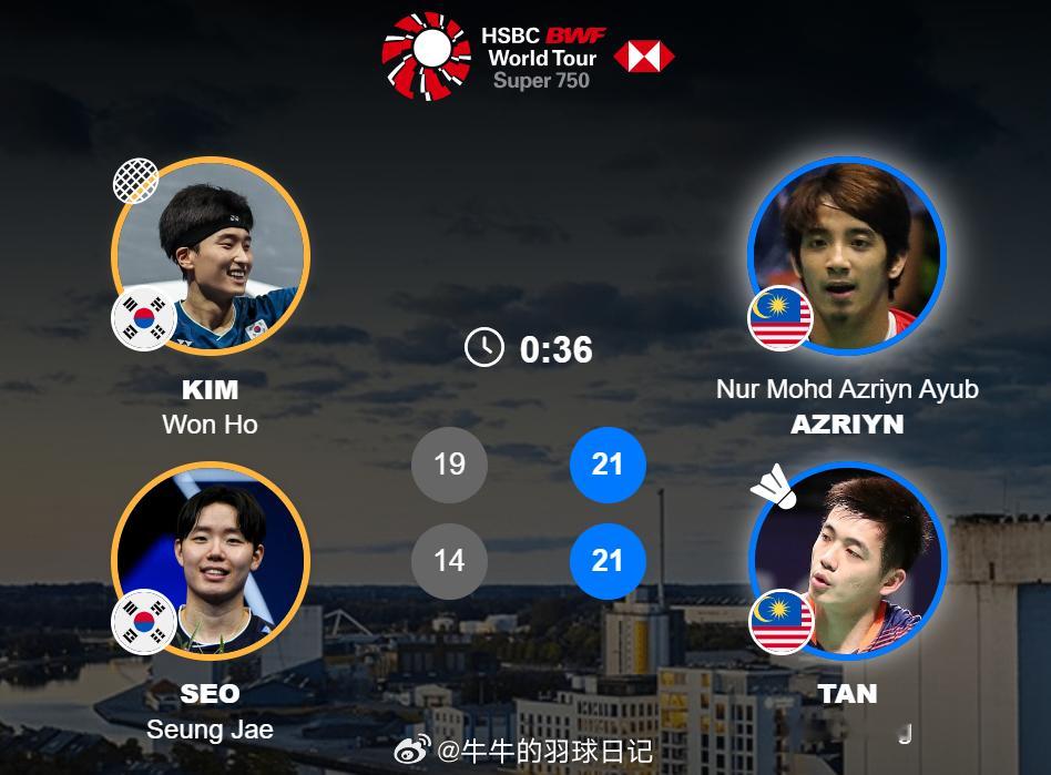 金元浩(1) 徐承宰 19-21 14-21 阿兹林 陈蔚强