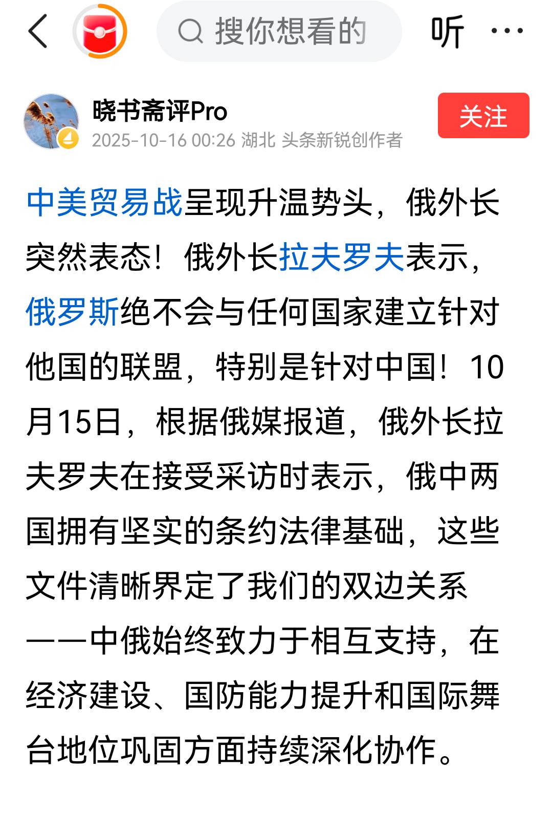 最近,俄罗斯外交部长直白地表示:俄罗斯不会与任何国家建立针对他国的联盟,特别是针对中国。 像这样的重要人物绝对不会随意说话的,他们每一句话都会有深刻的现实意义和非常强的针对性。 当下,中俄都面临着以美国为首的西方列强的全面围攻和打压,更应该高度互信,背靠背作战突围。在这个过程中,西方列强肯定会通过媒体等各种方式离间中俄,两国高层肯定没问题,但两国百姓一定要高度警惕,不要随声附和敌对势力,以免给国家添事。