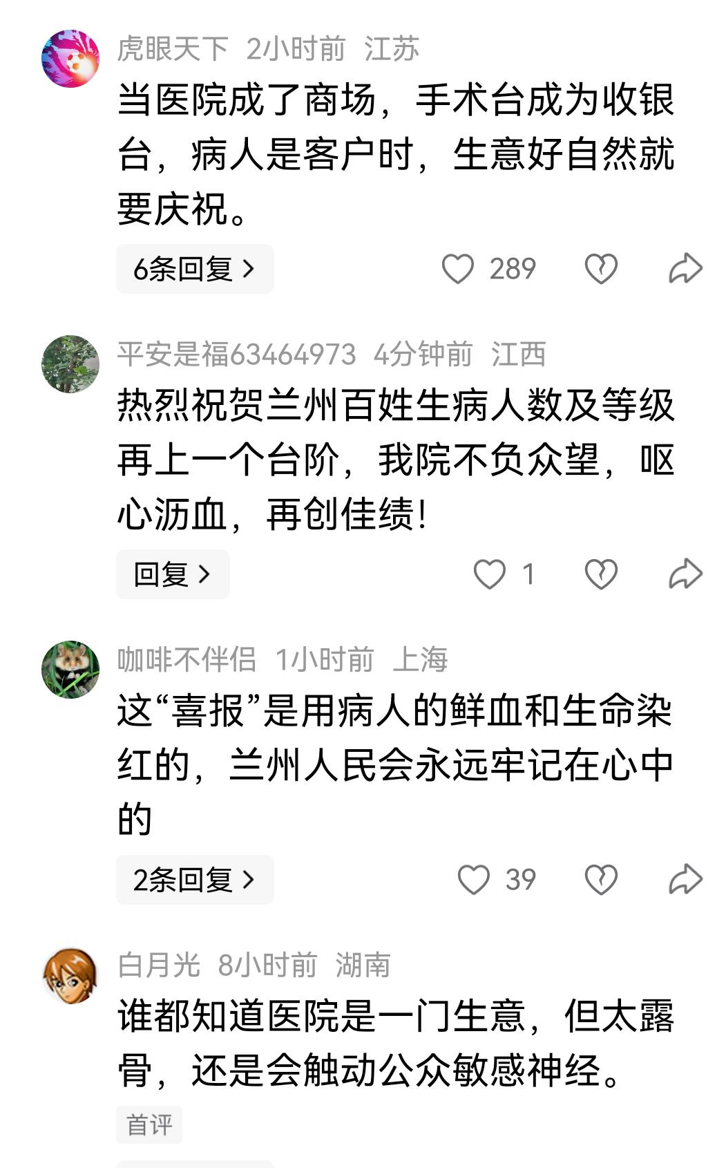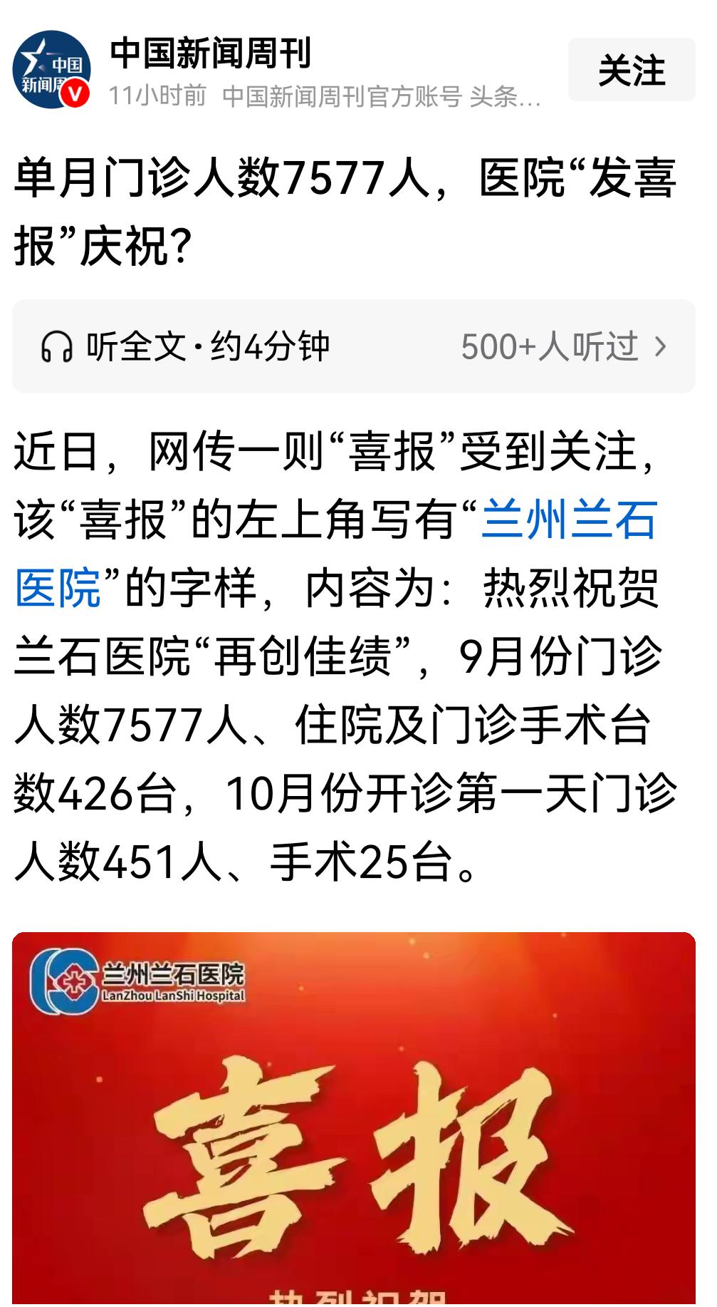 应该引发深思,医院发喜报,热烈庆祝门诊、住院及手术人数再创佳绩! 虽然这些看似医院成绩,但却遭到网友普遍质疑。毕竟诊疗数据背后是患者的病痛与家庭负担,医院把它当“喜报”,缺乏对患者的同理心,还让人联想到逐利和过度医疗。 这不是这一个医院或哪个医院的问题,而是整个社会医疗价值观导向的问题。如果医疗以谋利为目的,那么肯定希望病人越多越好,相应的治疗也不会以治好病为目的,而会以把尽可能多的健康人变成患者为医疗目标,最终变成病夫之国! 可悲!可叹!可怕!