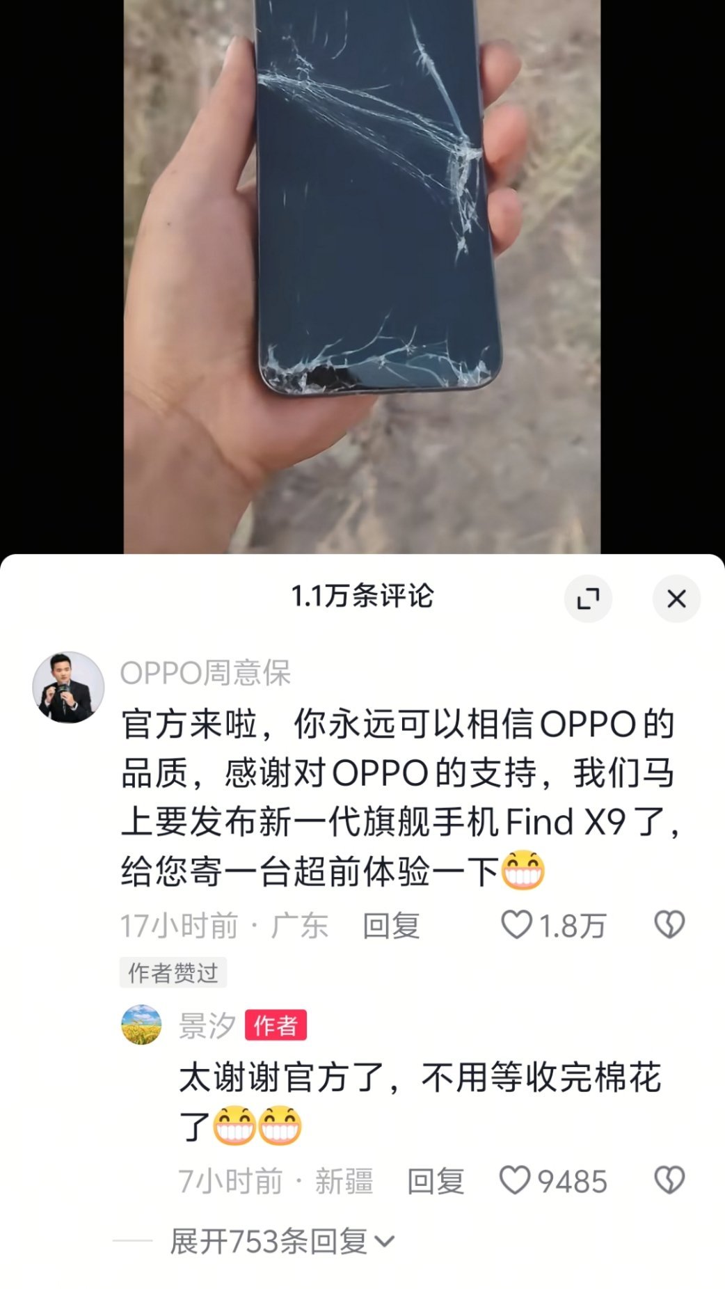 oppo手机质量有多硬,网友的手机被拖拉机,压成竖折叠了[笑cry][笑cry](见图),还能打电话给朋友(视频里有演示,直接用语音助手呼叫),oppo周总刷到了,直接大气送了一台最新产品FInd X9 ​​​