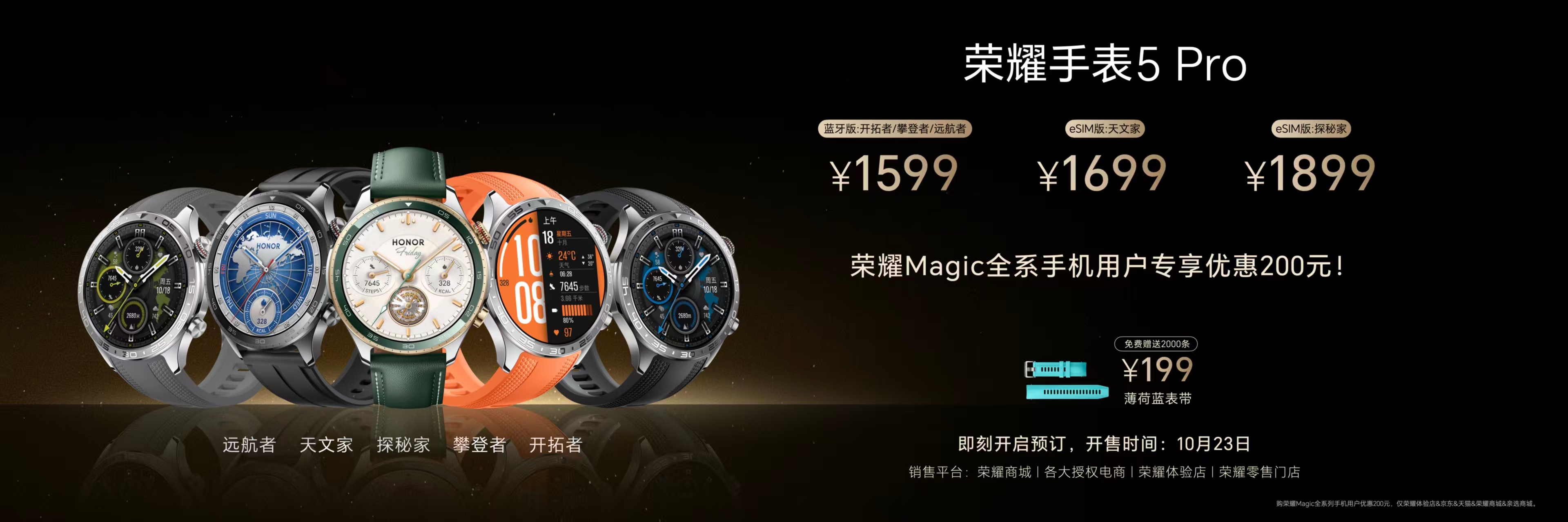 荣耀手表5 Pro,一次校准便可主动测量血压,实时出值。方寸间精准测量,开启腕上血压管理新时代!外观、运动、健康监测全方位出色,国补优惠价1359.2元起,荣耀Magic系列用户专享价1189.2元起。