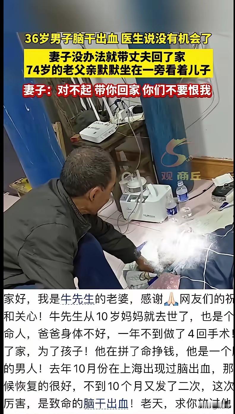 脑干出血,医生让送回了家。74岁的老父亲坐在他身边,寸步不离的守着。 身上插着的管子,显示着病情的严重性。因为身边维持生命的医疗设备众多,为了使用方便,只能让他躺在了地上。 36岁的他,10岁没了娘。老父亲当爹又当娘,把他拉扯大了,身体也熬坏了,一年里,病了4次。 为了改善家庭条件,他努力工作,拼命挣钱,却因为脑出血,最终比父亲先倒下。 麻绳尽从细处断,厄运专找苦命人。 希望能出现奇迹,不要让老人家在经历了中年丧妻的痛苦后,在晚年又要承受失去儿子的痛苦。