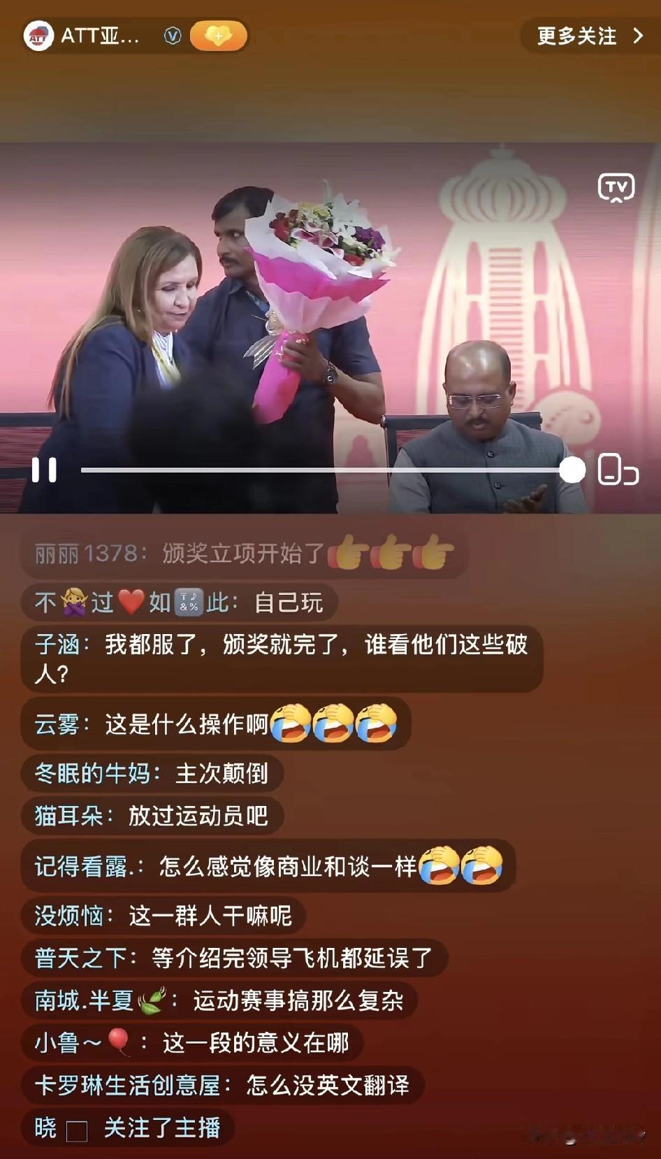 难怪央妈不转播,转播了也不知道咋解说,三哥愣是自嗨了40分钟,开了个演唱会 曹指导说的,听着那个音乐都怕眼镜蛇跑出来,一共自嗨了一个多小时;还好几波领导发言,都想露露脸。愣是把观众说睡着了,眼睛一睁5点了,赶紧看回放 最好笑的是先给自己颁上奖了,一束花拿下去又拿上来给下一个。然后最后合影来了一大波莫名其妙的人,感觉比运动员人还多。曹魏,郭什么那个字不会读,刘丁硕,方博,这几个直播间都生无可恋 开始弹幕一堆人骂,还觉得大家没耐心,后面吧,我骂的也挺凶的,洗了澡,洗了衣服,熨完衣服都没开始,主要还没翻译,真的服了。头一回见和老太太的裹脚布一样又臭又长的颁奖仪式!