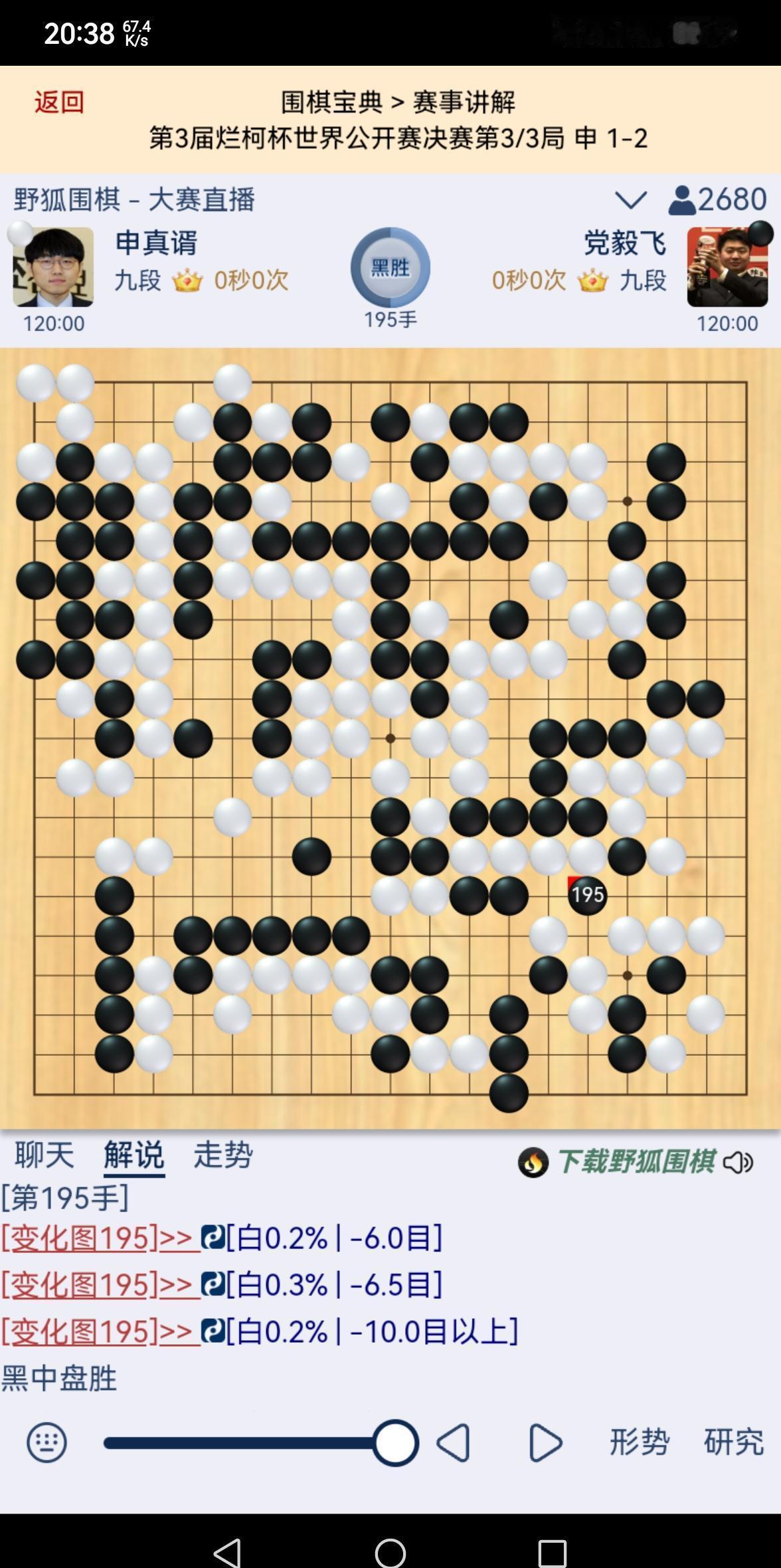 党毅飞赢了,申真谞的决胜局不败神话,碎了。 三番棋,一胜一负,最后一盘黑棋,胜率