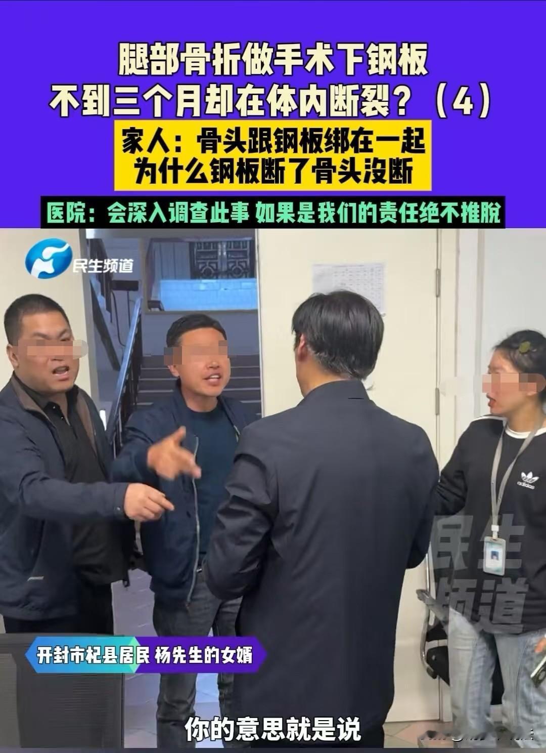 开封,杨大爷的腿刚用钢板固定好没几天,那钢板就断了。摸着肿得发亮的腿,老人又急又疼,怀疑是钢板质量不过关;可医院那边却说是他没听话,提前下地活动,才把钢板压断的。争执不下时,大爷又爆出个更揪心的事——去大医院检查,竟发现腿里留着块硬币大的塑胶,像极了手术手套的胶皮。这一下,家属彻底坐不住了,非要医院给个明明白白的说法。 事情得从几个月前说起。杨大爷在家门口的田里忙活,脚下一滑,咔嚓一声,左腿就动不了了。女婿慌得不行,赶紧架着他往县医院跑,一路上老人疼得直冒冷汗,嘴里还念叨着,别耽误了秋收。 到了医院,医生一检查,说骨头折得厉害,得开刀装块钛合金钢板固定,等骨头慢慢长好。这材质好,结实,好多人用着都没事,医生拍着胸脯保证。 杨大爷和家属也没多想,点点头就应了。6月10号,手术做了快两个小时,出来时老人腿上裹着厚厚的纱布,麻药过后,疼得夜里都睡不安稳,却总盼着,等钢板撑住了,就能早点下地。 术后一个月复查,片子一出来,医生笑着说,恢复得不错,骨头长得挺好。杨大爷攥着片子,看着上面清晰的钢板轮廓,心里的石头落了地,逢人就说,再过俩月,我就能下地干活了。 可没高兴多久,到了该第二次复查的时候,杨大爷的腿突然肿了起来,轻轻一碰就钻心地疼,别说下地,连翻身都费劲。 女婿一看不对劲,连夜开车把他送回县医院,一拍片,所有人都傻了眼——腿里的钛合金钢板,竟从中间断成了两截! 这可是钢板啊,怎么比筷子还脆,儿子攥着拳头,声音都发颤。家属围着医生要说法,心疼杨大爷刚遭完罪,又得挨一刀做二次手术。 杨大爷躺在病床上,看着自己肿得像馒头的腿,眼圈都红了,我都按嘱咐躺着,没敢瞎动,怎么就断了? 没多久,医院负责售后的工作人员来了,手里捏着支铅笔,比划着打比方,你看这铅笔,断了要么是笔芯脆,要么是你使劲掰。 钢板也一样,要么是质量问题,要么就是提前负重了。我们这钢板用了多少年,从没出过这情况,多半是大爷没忍住,提前下地了。 不可能,女婿当即反驳,我爸术后一直躺着,连床都很少下,怎么会负重?你们这就是质量差!双方吵得面红耳赤,可杨大爷的腿耽误不起,家属只好先凑钱,把老人转到郑州的大医院。 更让人气愤的事还在后头。郑州的医生打开伤口一看,除了断裂的钢板,竟还夹着一块塑胶碎片,软软的,像从手术手套上撕下来的,足足有硬币那么大。 手术时怎么能把这东西落里头?这也太不负责了,医生的话,让家属更认定是县医院的疏忽。 杨大爷在郑州做完二次手术,躺在床上养伤,连说话的力气都没了。女婿咽不下这口气,又跑回县医院讨说法。 这次出面的是副院长,拿着片子,语气肯定,你们看,钢板断了,但骨头没移位、没再折,这说明是骨头还没长好,就受力了——力量全压在钢板上,可不就断了?肯定是提前下地了。 家属哪里肯信,反复强调杨大爷一直遵医嘱休养。见家属不松口,副院长才松了口,行,那钢板咱们拿去鉴定,是质量问题,医院认;要是没毛病,那就是你们的责任,到时候赔偿的事,就得重新说。 至于当初的主治医生为啥一直不露面,副院长叹了口气,不是他做错了躲着,是怕你们气头上吵起来,伤了和气——毕竟他是给大爷开刀的医生,你们心里有火,见了面难免闹僵。 如今,那块断裂的钢板还没送去鉴定,杨大爷还在病床上躺着,腿上的伤口没好,心里的疙瘩更解不开。 家属天天守着,就盼着鉴定结果出来,能给老人一个公道——毕竟这遭的两回罪,总不能稀里糊涂就过去了。 《民法典》第一千二百一十八条:患者在诊疗活动中受到损害,医疗机构或者其医务人员有过错的,由医疗机构承担赔偿责任。 杨大爷在县医院做手术,腿里不光钢板断了,还留了块硬币大的塑胶碎片,这明显是手术时没清理干净,属于医生的操作失误。 不管钢板断裂是不是提前活动导致的,单说把异物留在体内这事,就够证明医院有过错了,杨大爷一家完全能凭这个找医院要赔偿。 《民法典》第一千二百二十三条:因药品、消毒产品、医疗器械的缺陷,或者输入不合格的血液造成患者损害的,患者可以向药品上市许可持有人、生产者、血液提供机构请求赔偿,也可以向医疗机构请求赔偿。患者向医疗机构请求赔偿的,医疗机构赔偿后,有权向负有责任的药品上市许可持有人、生产者、血液提供机构追偿。 杨大爷的钛合金钢板才用一个多月就断了,家属怀疑质量有问题,医院却说是提前活动导致的。这种情况就得去做钢板鉴定,要是鉴定出钢板真有质量缺陷,不管医院怎么辩解,杨大爷都能找医院或钢板厂家要二次手术的医药费等赔偿。 对于此事,大家如何看? 素材:河南民生频道2025-10-16