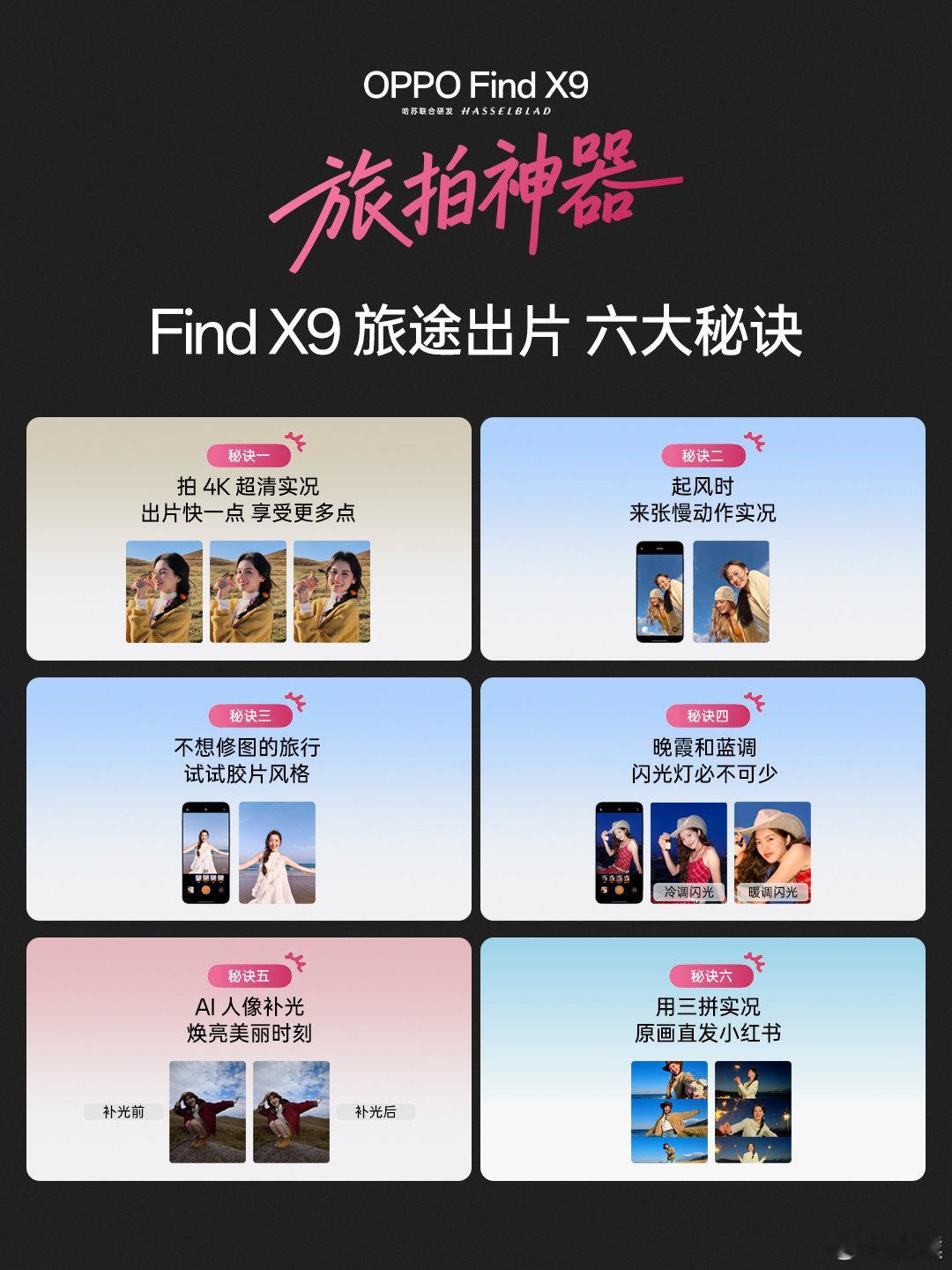 OPPO Find X9全球首发哈苏8K超清照片、直出4K超清实况,还搭载Ultra同款丹霞色彩还原镜头,更有哈苏磁吸闪光灯、AI人像补光等新玩法。怎么样,心动了吗?