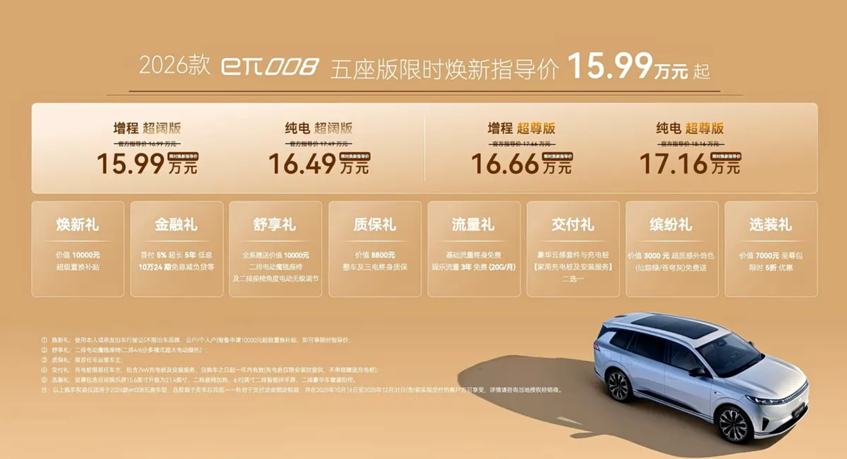 10月16日,2026款eπ008五座版正式上市,新车共推出4款车型,限时售价15.99万元-17.16万元。