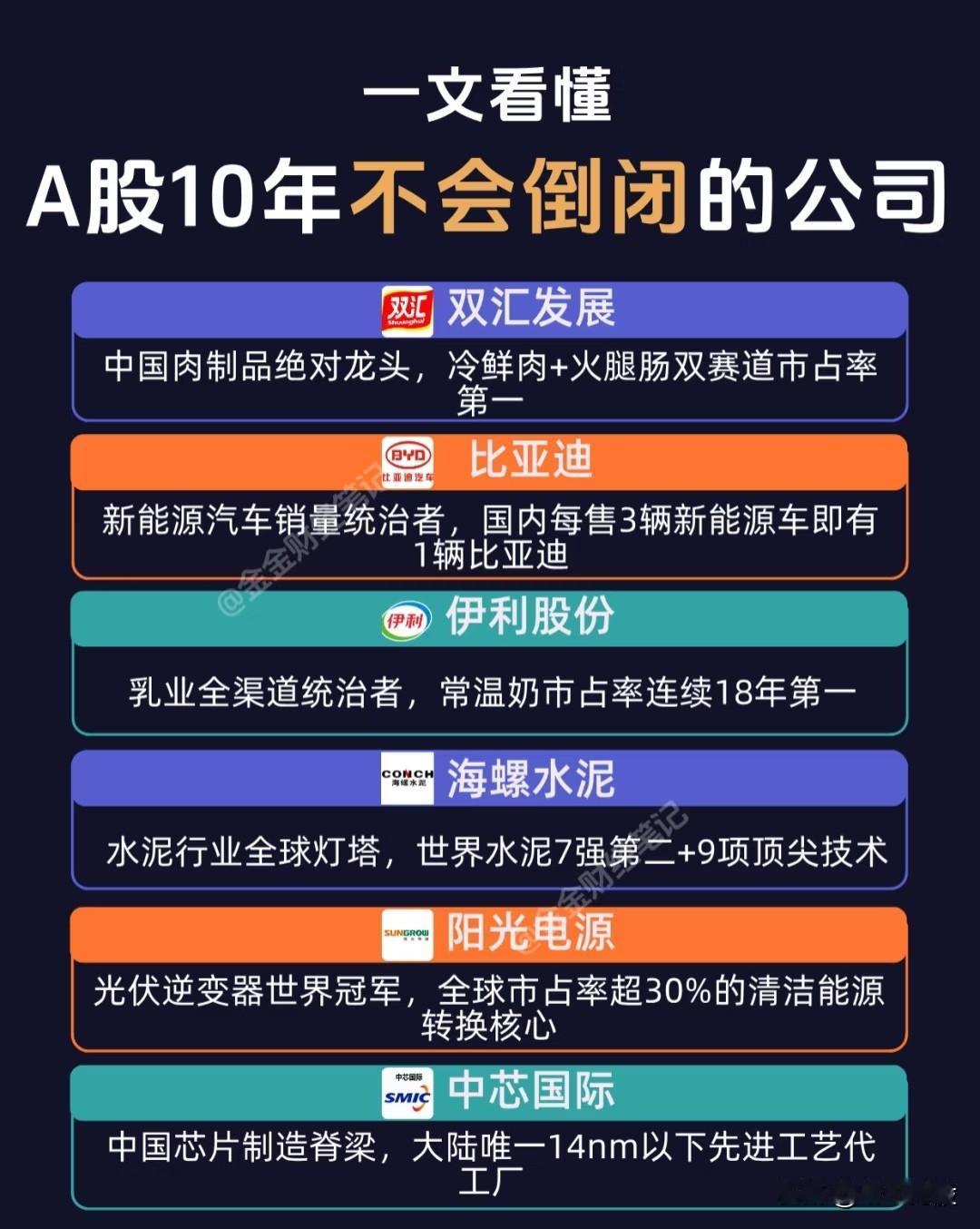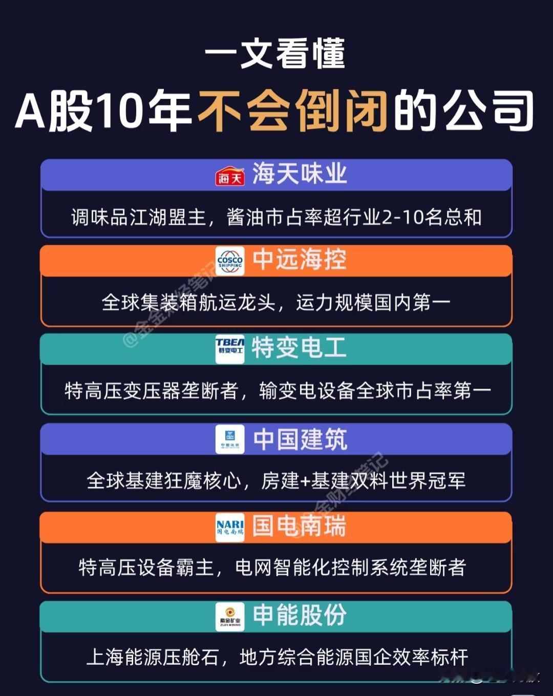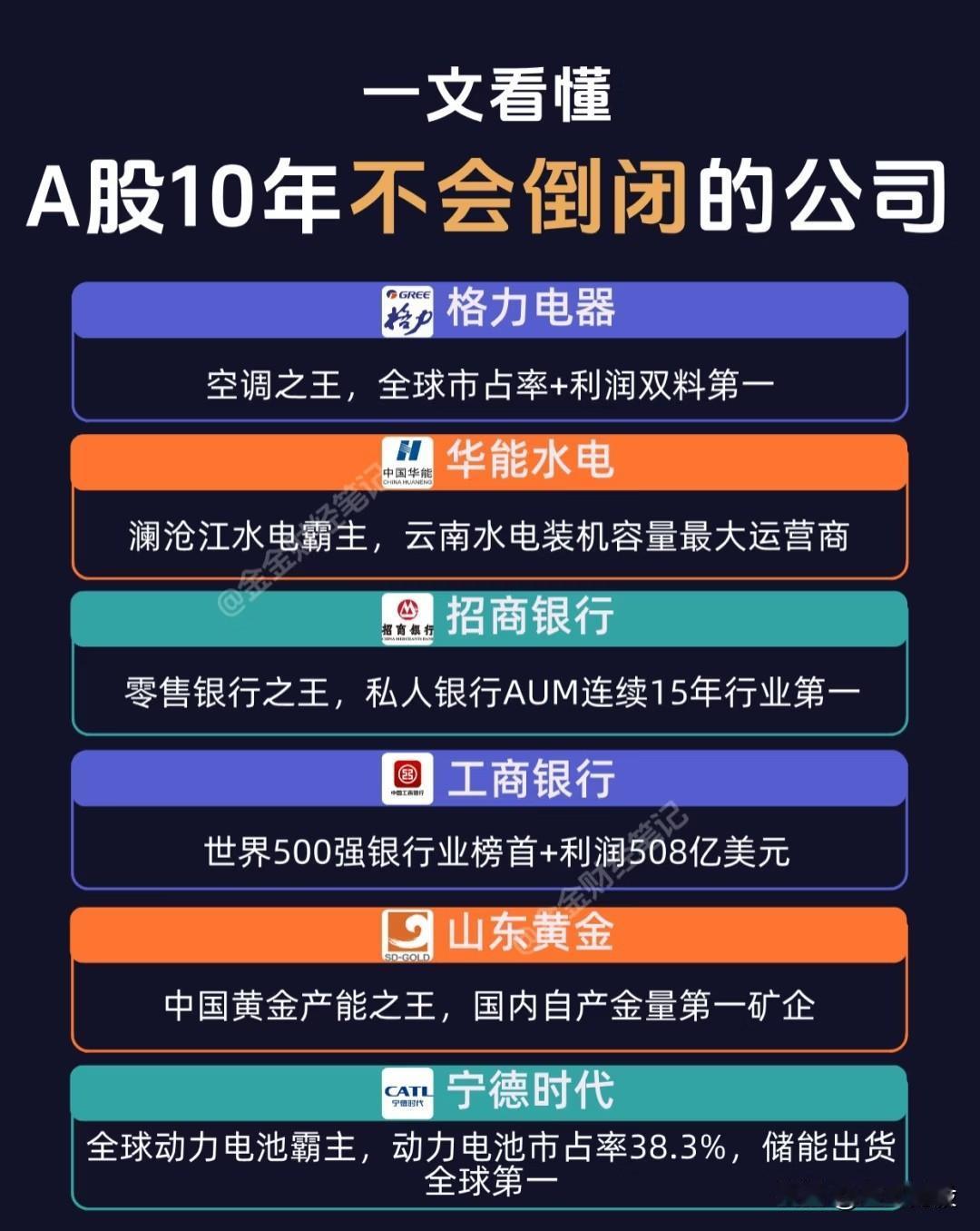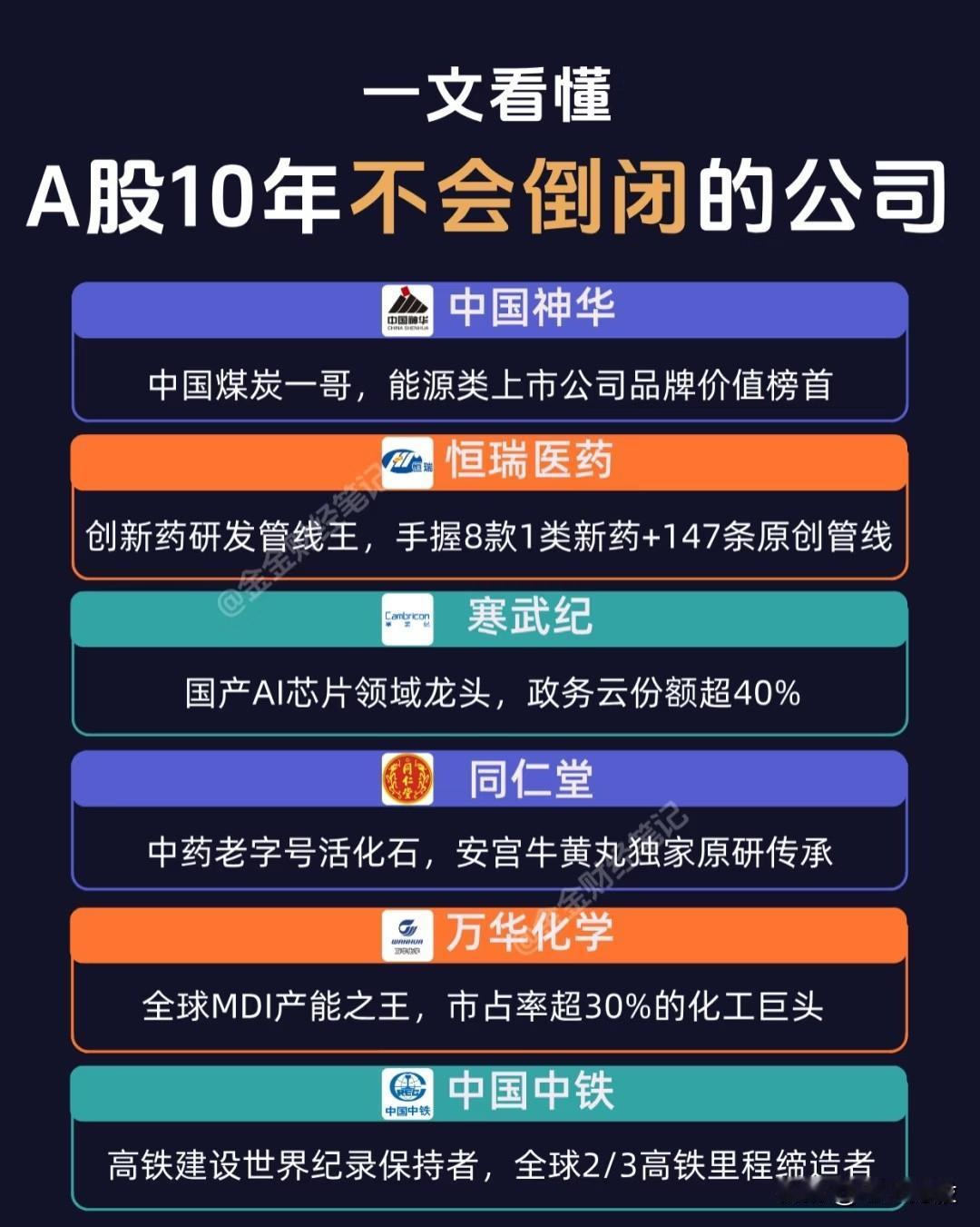 “A股市场上被认为未来10年内极难倒闭”的优质企业,这些公司普遍具备以下特点: - 行业龙头地位稳固,市占率高; - 拥有垄断性资源(如矿产、水利、交通基础设施等); - 是国家战略性产业(如能源、电力、芯片、金融等)的中坚力量; - 盈利能力强,品牌价值高,长期业绩稳健; - 很多公司具有全球竞争力,在国际市场也名列前茅。 二、各图片重点企业及亮点速览: 🟣 第1张图:列举了6家极具代表性的行业龙头: 1. 贵州茅台:中国白酒行业霸主,飞天茅台单品年销售额超1200亿; 2. 紫金矿业:有色金属龙头,全球市值前五矿企中唯一中国企业; 3. 长江电力:全球最大水电运营商,拥有三峡+葛洲坝等垄断性资产; 4. 农业银行:2025年世界500强银行排名第30,国有大行之一; 5. 北方华创:国产芯片设备先锋,全球半导体设备十强中唯一大陆企业; 6. 宁沪高速:中国高速公路上市企业标杆,运营沪宁高速这一黄金动脉,资产超700亿。 🟠 第2张图:介绍了6家在不同领域具有极强壁垒的公司: 1. 中国神华:中国煤炭行业一哥,能源上市公司中品牌价值最高; 2. 恒瑞医药:创新药龙头,拥有8款1类新药和147条研发管线; 3. 寒武纪:国产AI芯片领先者,政务云市场份额超40%; 4. 同仁堂:中药老字号,安宫牛黄丸等核心产品为独家传承; 5. 万华化学:全球MDI产能第一,市占率超30%的化工巨头; 6. 中国中铁:全球高铁建设的领军者,建造了全球三分之二的高铁里程。 ⚫ 第3张图 展示了6家在各自细分领域处于领导地位的企业: 1. 海天味业:调味品行业霸主,酱油市占率超过行业内第2-10名总和; 2. 中远海控:全球集装箱航运龙头,国内运力排名第一; 3. 特变电工:特高压变压器领域垄断者,输变电设备全球市占率第一; 4. 中国建筑:全球基建狂魔,房建与基建双料世界冠军; 5. 国电南瑞:特高压及电网智能化控制系统的垄断者; 6. 中能股份 / 上海能源:地方综合能源国企中的效率标杆。 注:第三张图中部分公司名称识别略有误差,但核心信息仍可辨。 🔵 第4张图:重点介绍了6家金融、能源、消费和科技领域的巨头: 1. 格力电器:空调行业全球市占率和利润双第一; 2. 华能水电:澜沧江流域水电霸主,云南最大水电运营商; 3. 招商银行:零售银行之王,私人银行资产管理规模(AUM)连续15年全国第一; 4. 工商银行:全球银行业利润最高,世界500强银行榜首,年利润达508亿美元; 5. 山东黄金:中国黄金产能第一,自产金量国内领先; 6. 宁德时代:全球动力电池市场份额38.3%,全球储能出货量第一。 🟢 第5张图:展示了6家在食品、新能源、乳业、建材、光伏与芯片制造领域的绝对龙头: 1. 双汇发展:中国肉制品行业绝对龙头,冷鲜肉和火腿肠双赛道市占率第一; 2. 比亚迪:中国新能源汽车销量统治者,国内每卖出3辆新能源车就有1辆是比亚迪; 3. 伊利股份:乳制品行业全渠道统治者,常温奶市占率连续18年全国第一; 4. 海螺水泥:全球水泥行业领先企业,世界水泥7强中排第二,拥有9项顶尖技术; 5. 阳光电源:全球光伏逆变器市场冠军,市占率超30%,是清洁能源转换核心企业; 6. 中芯国际:中国大陆芯片制造脊梁,是内地唯一能量产14nm以下先进制程的晶圆代工厂。 三、总结洞察: 1. 行业分布广泛且关键:涵盖消费(白酒、食品、家电、乳业)、能源(煤炭、电力、石油、新能源)、金融(银行)、科技(芯片、AI、半导体设备)、基建(建筑、高铁、水电、高速)、医药(中药、创新药)、材料(水泥、化工)等多个国民经济命脉和战略行业。 2. “不会倒闭”的核心原因: - 垄断或寡头地位:如长江电力(水电)、中国神华(煤炭)、中远海控(航运)、海螺水泥(建材)等; - 品牌护城河极深:如贵州茅台、格力电器、伊利股份、双汇发展; - 国家战略级企业:如中芯国际、国电南瑞、中国中铁、工商银行; - 全球领先的技术或产能:如宁德时代、万华化学、北方华创、阳光电源; - 稳定的现金流与高分红属性:如长江电力、招商银行、农业银行。