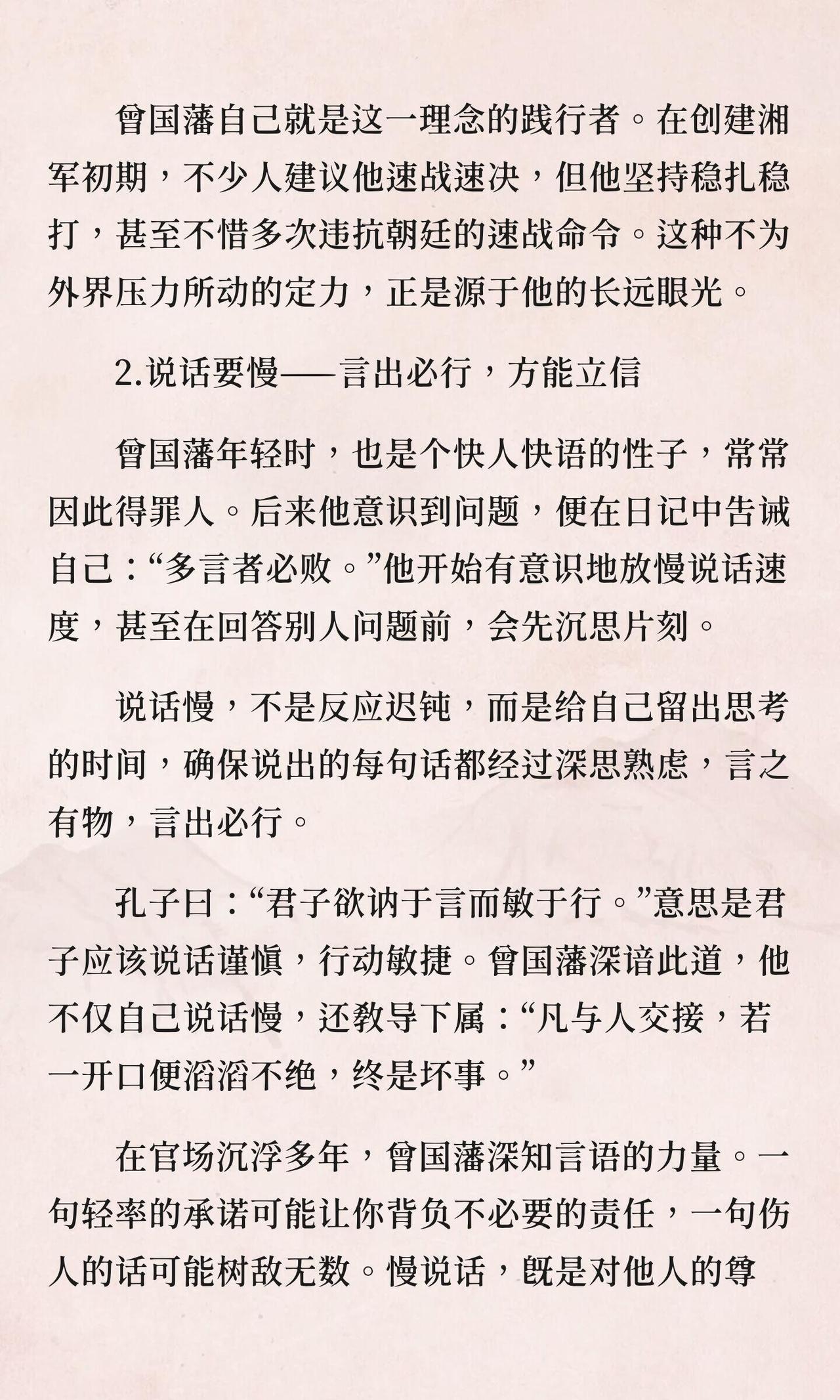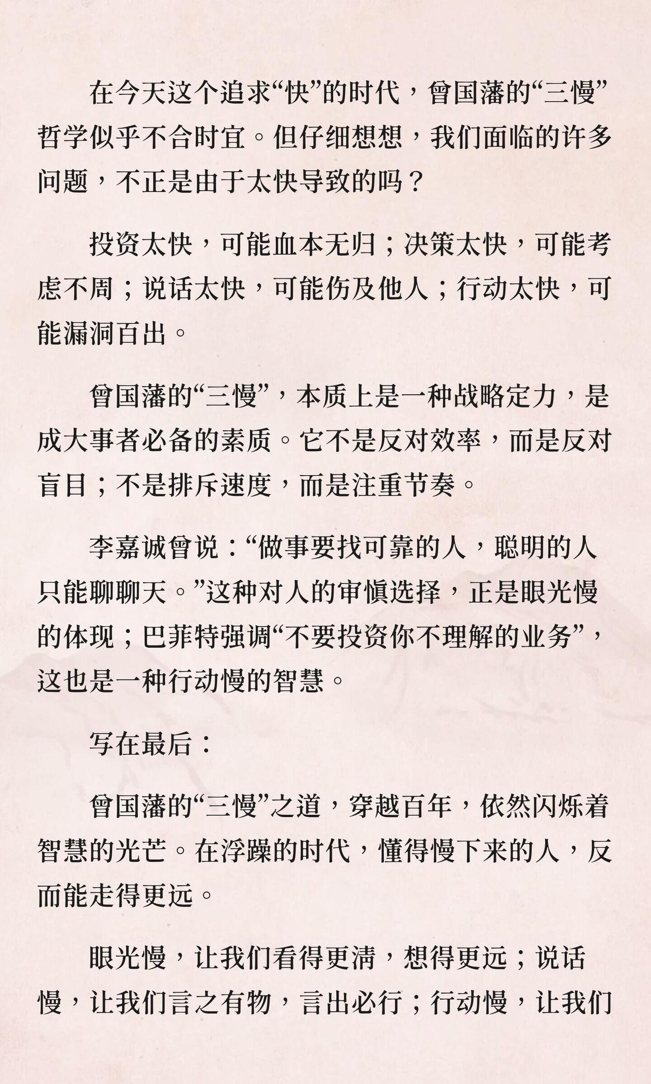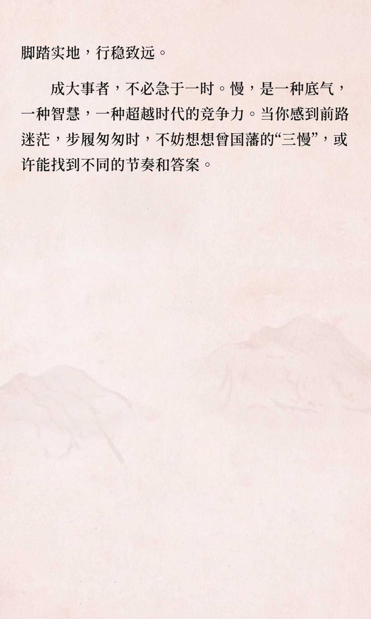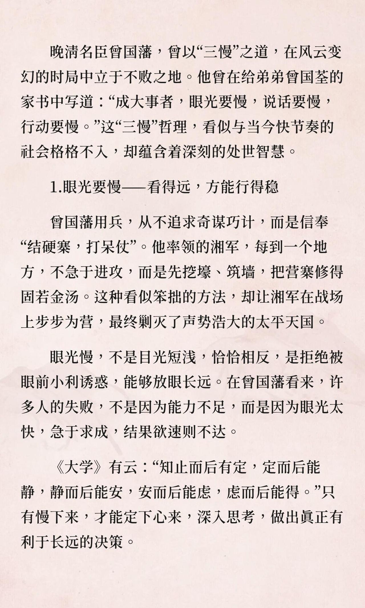 曾国藩坦言:成大事者,必有三慢。 第一,眼光要慢,看得远,方能行得稳。 第二,行