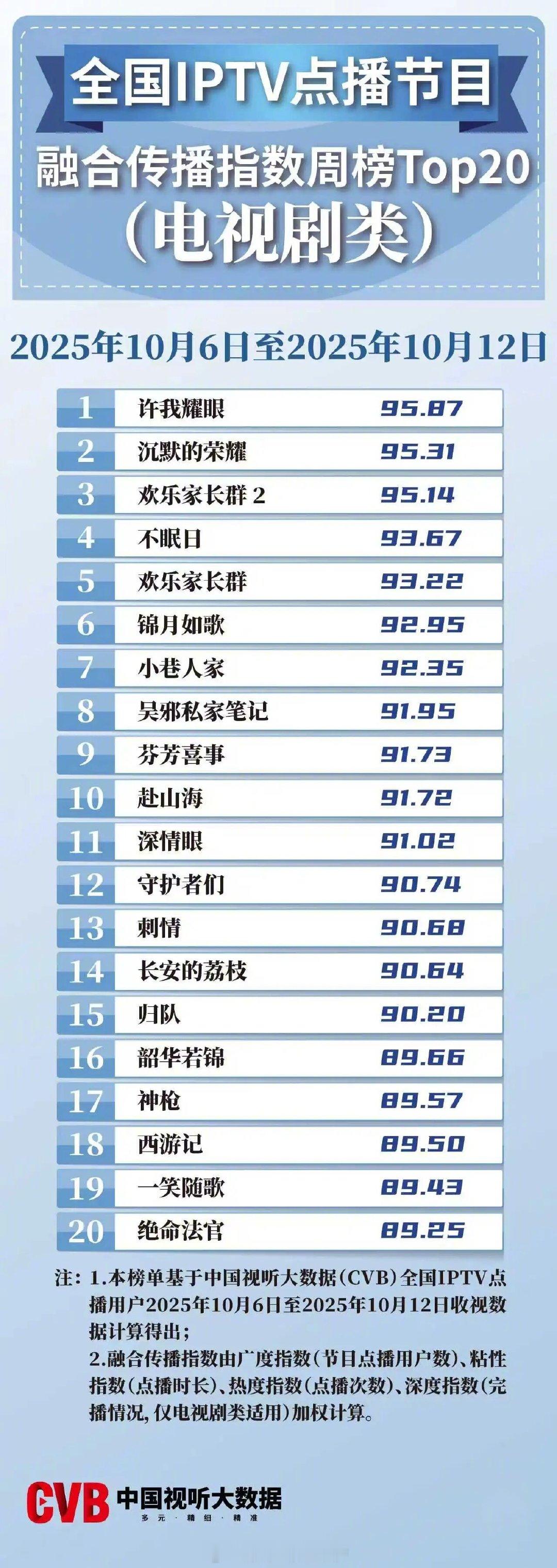 2025年10月6日-10月12日中国视听大数据CVB全国IPTV点播节目融合传播指数周榜Top20(电视剧类)