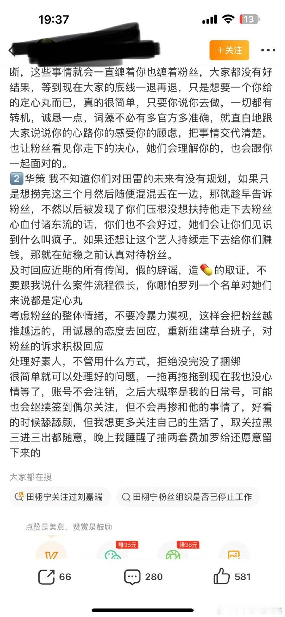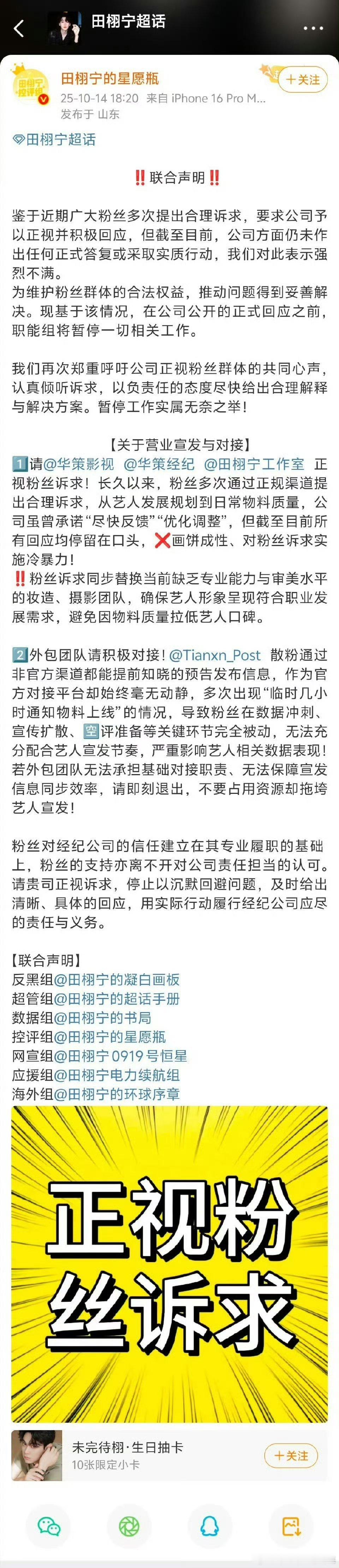 田栩宁职能组开始罢工,以求华策正视粉丝诉求……​​​