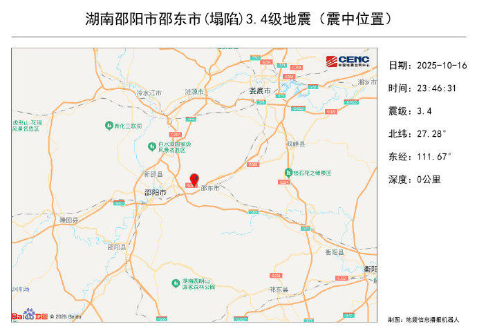 10月16日23时46分在湖南邵阳市邵东市(塌陷)(北纬27.28度,东经111.67度)发生3.4级地震。