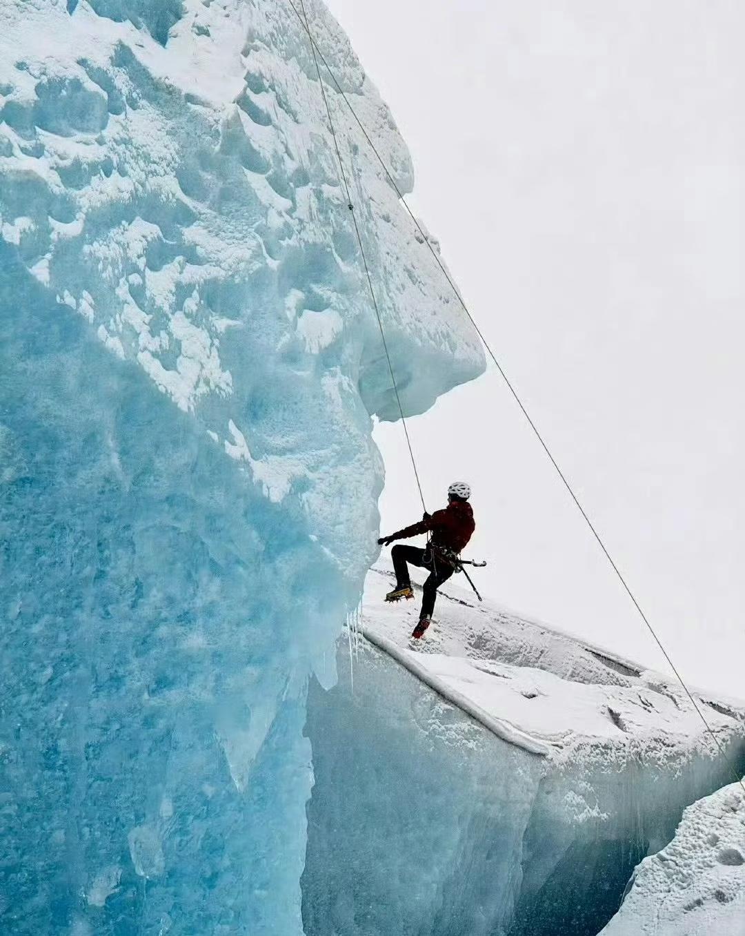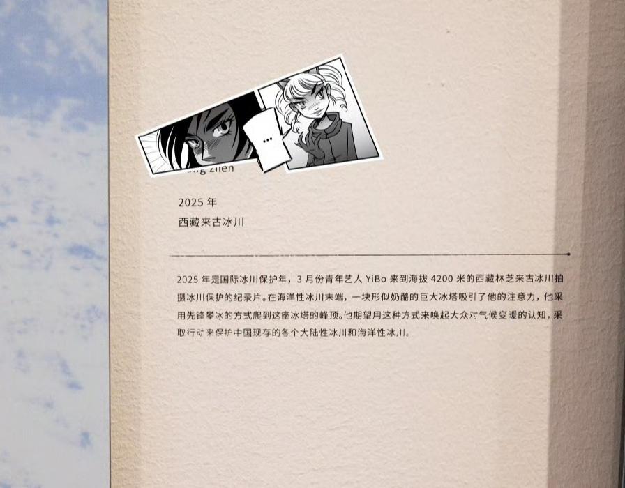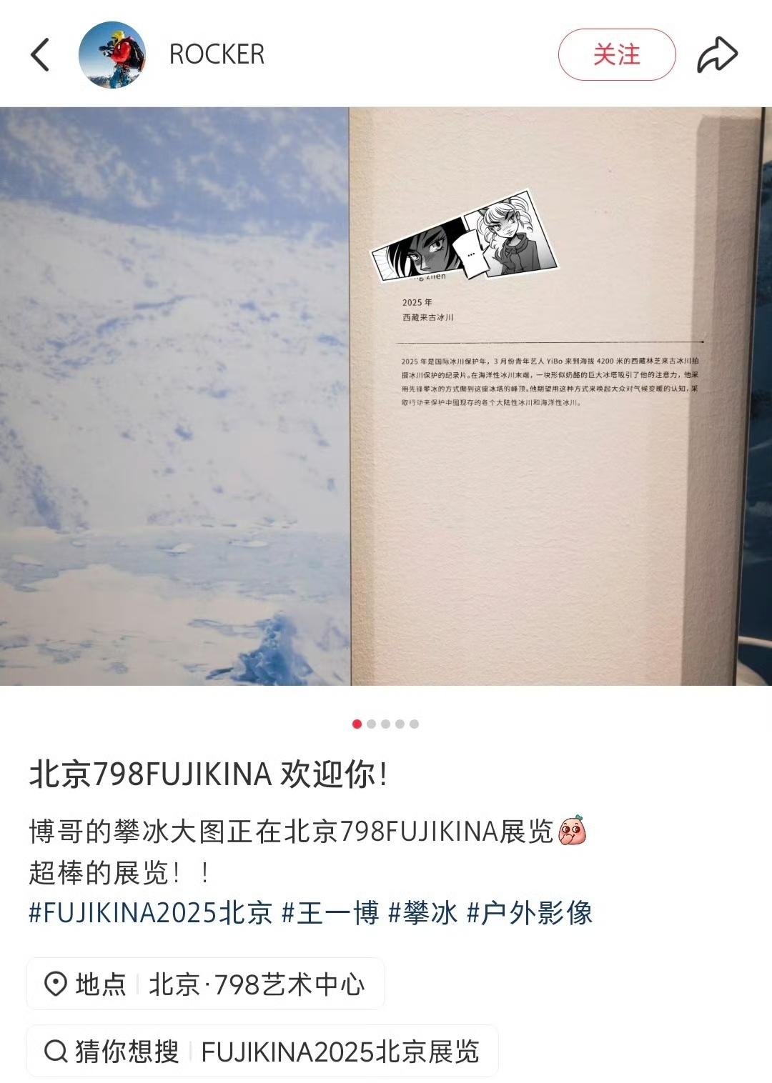冰攀,“先锋攀”! 王一博冰攀大图正在北京798FUJIKINA展览,作品介绍处写明王一博是采用先锋攀冰的方式爬到顶峰的[赞]! 这是王一博今年远赴西藏冰川拍摄的联合国关于保护冰川的宣传片,并向全世界传递中国青年的声音。