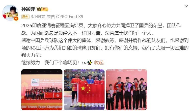 孙颖莎带队复仇日本夺魁,赛后一席话催人泪下,在她心中永远国家利益至上 在不久前结束的亚锦赛女团决赛上,中国队和日本队狭路相逢。本场比赛,可谓赛事的最强球队和实力排名第二的球队的强强对话。尽管从世界排名的角度来看,国乒女队是高于对手的,但是日本女队的个别球员也是比较强的,比如令人头疼的桥本帆乃香,比如有着巨大潜能的张本美和。而且,在上一届亚锦赛上,国乒女队就曾输给过日本女队。 但是,不管怎么说,国乒的目标没有变,那就是夺冠。第一盘,王曼昱出战。在第一局她遇到了麻烦,之后她及时调整,然后贡献了一场教科书式的比赛。以后怎么打削球手,王曼昱给出了答案。第二盘,孙颖莎出战。面对年轻又充满活力的张本美和,孙颖莎打得非常强硬,一口气连续拿到三局的胜利。第三盘,蒯曼出战。在先丢一局的情况下,蒯曼强硬回击,连下三城。 最终,国乒女队3-0横扫日本女队,在复仇的同时,成功登顶。赛后,国乒的姑娘们都非常开心,大家站在场地中央举着国旗合照,面带微笑。其中,孙颖莎显得极其开心,她像如释重负一般。这一届赛事,孙颖莎的发挥都很稳健,不管打谁都显得得心应手、游刃有余。值得一提的是,赛后孙颖莎更新了自己的社交媒体,她是这么说的: “2025印度亚锦赛征程圆满结束……团队作战、为国而战总是带给人不一样的力量,荣誉属于我们每一个人。感谢中国乒乓球队这个伟大的集体,感谢教练,感谢并肩作战的队友们……拥有你们的支持,就有了克服一切困难的强大力量。继续努力,我们下个赛场见!”孙颖莎的话含金量极高,同时催人泪下。可以看到:第一,在孙颖莎的眼中个人得失不算什么,排在第一位的永远是国家利益、集体利益;第二,孙颖莎把冠军归于所有人,不仅仅是她们几个;第三,孙颖莎时刻都在惦记国乒的球迷,她认为球迷给了国乒力量。 如此孙颖莎,怎么不令人喜爱呢?