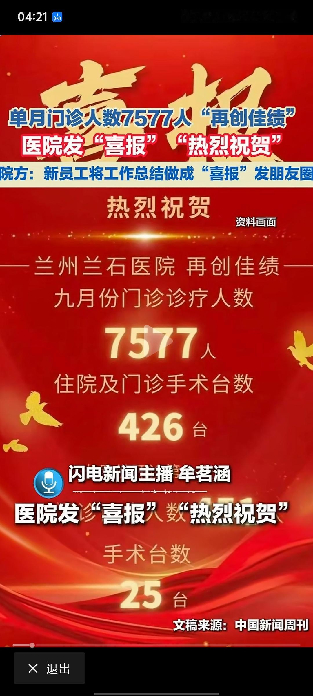 医院新员工把工作总结做成“喜报”,7577 门诊量引热议:别让“喜报式总结”消解专业温度 兰州兰石医院新员工将单月7577门诊量、426台手术的工作总结做成“喜报”发朋友圈,红底金纹的版式引发舆论关注。 医院宣传本应立足专业,过度“喜报化”包装易让公众对医疗价值产生误读。医院真正应该总结提高的是医疗技术,医疗工作的核心是生命守护,而非数据狂欢。希望行业能回归医疗本质,以专业服务而非流量式宣传赢得信任,让每一份诊疗背后的责任与温度被真正看见。