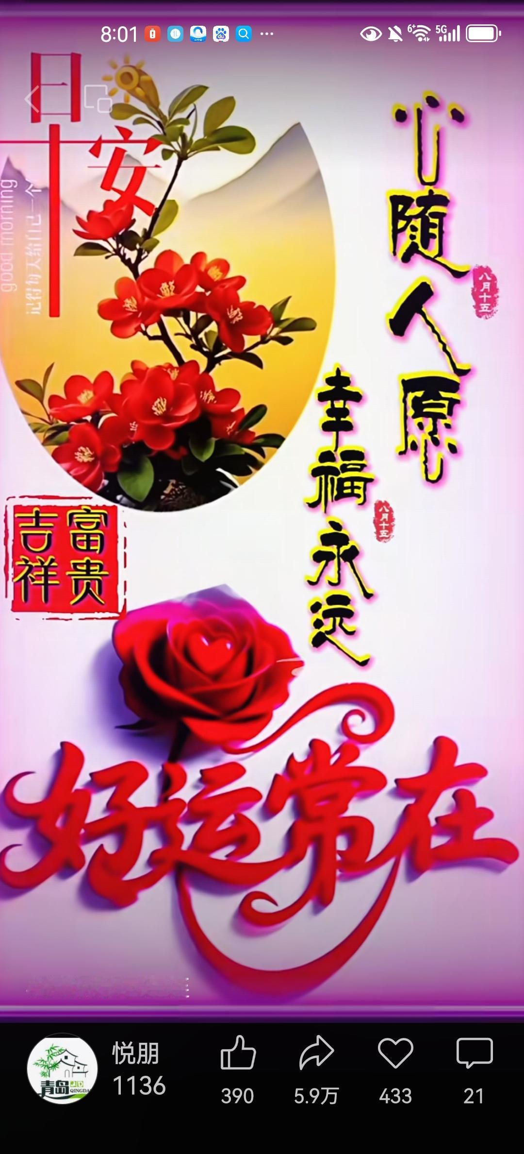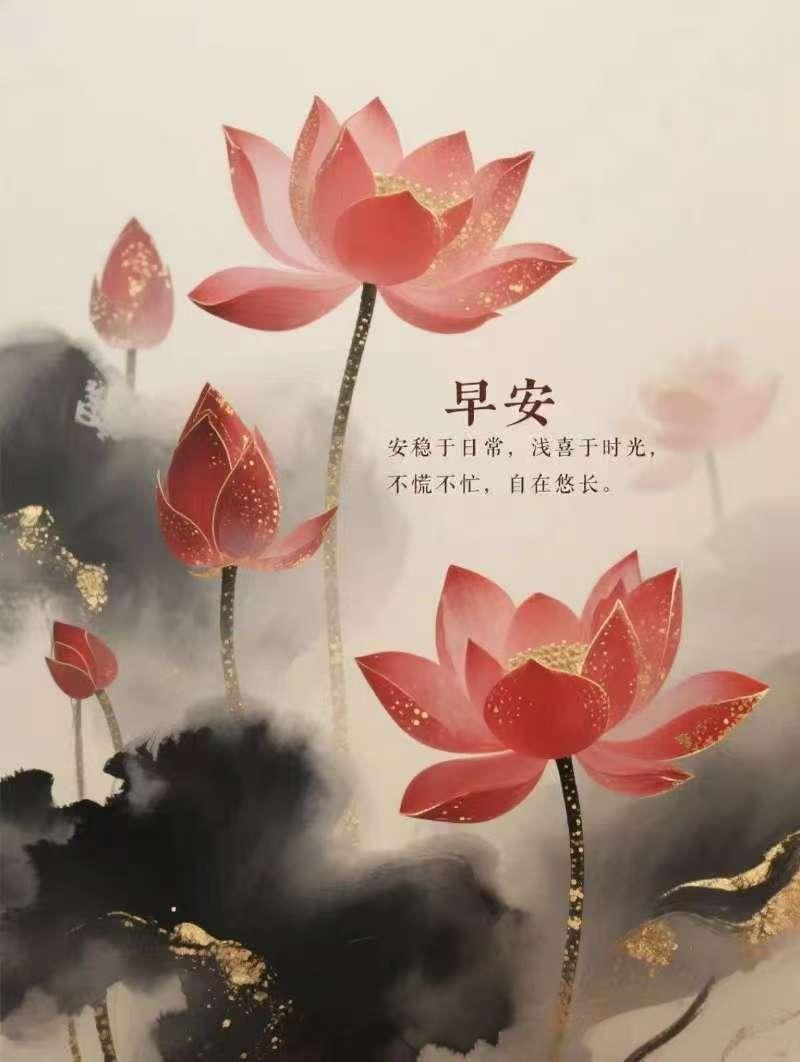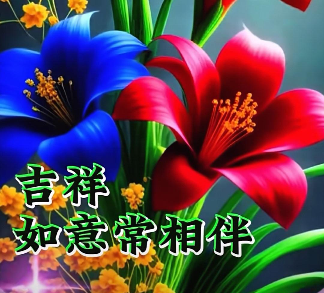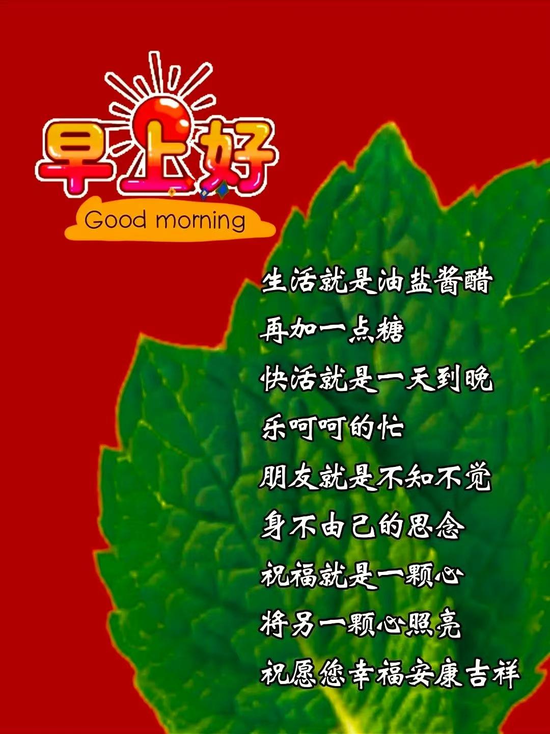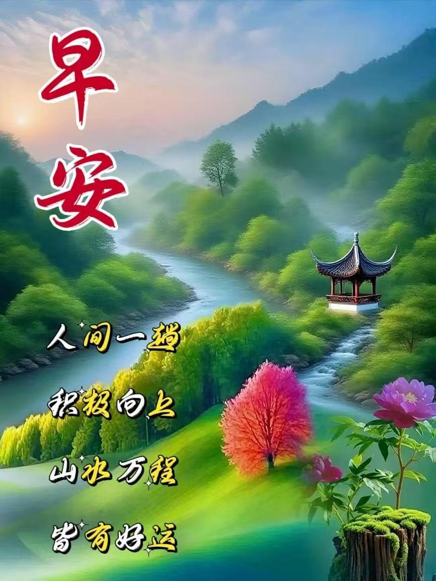 美麗的清晨旭日東昇, 真誠的祝福叩門送上, 願您精神好、心情好、 運氣好身體好一