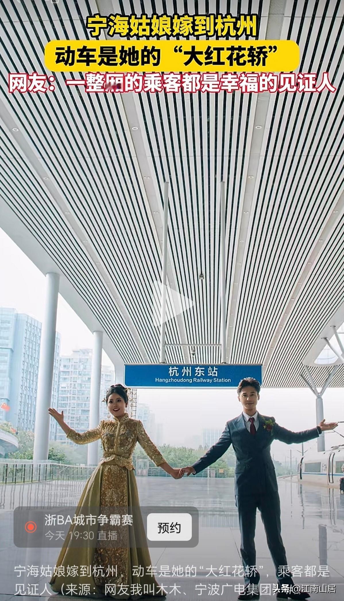 宁海姑娘嫁到杭州,婚礼当天,由于中午就要赶到杭州。考虑到国庆假期,堵车问题,时间会比较紧。所以突发奇想,换成了坐高铁去杭州。并且在车站和车厢内,两人拍照留下了美好的瞬间。同时,在车厢内,这对新人也送上了喜糖,给同车厢的乘客沾沾喜气,收获了一整车厢人的祝福。正如网友所说,“动车是大红花轿,乘客是幸福的见证人”。 来源:宁波发布