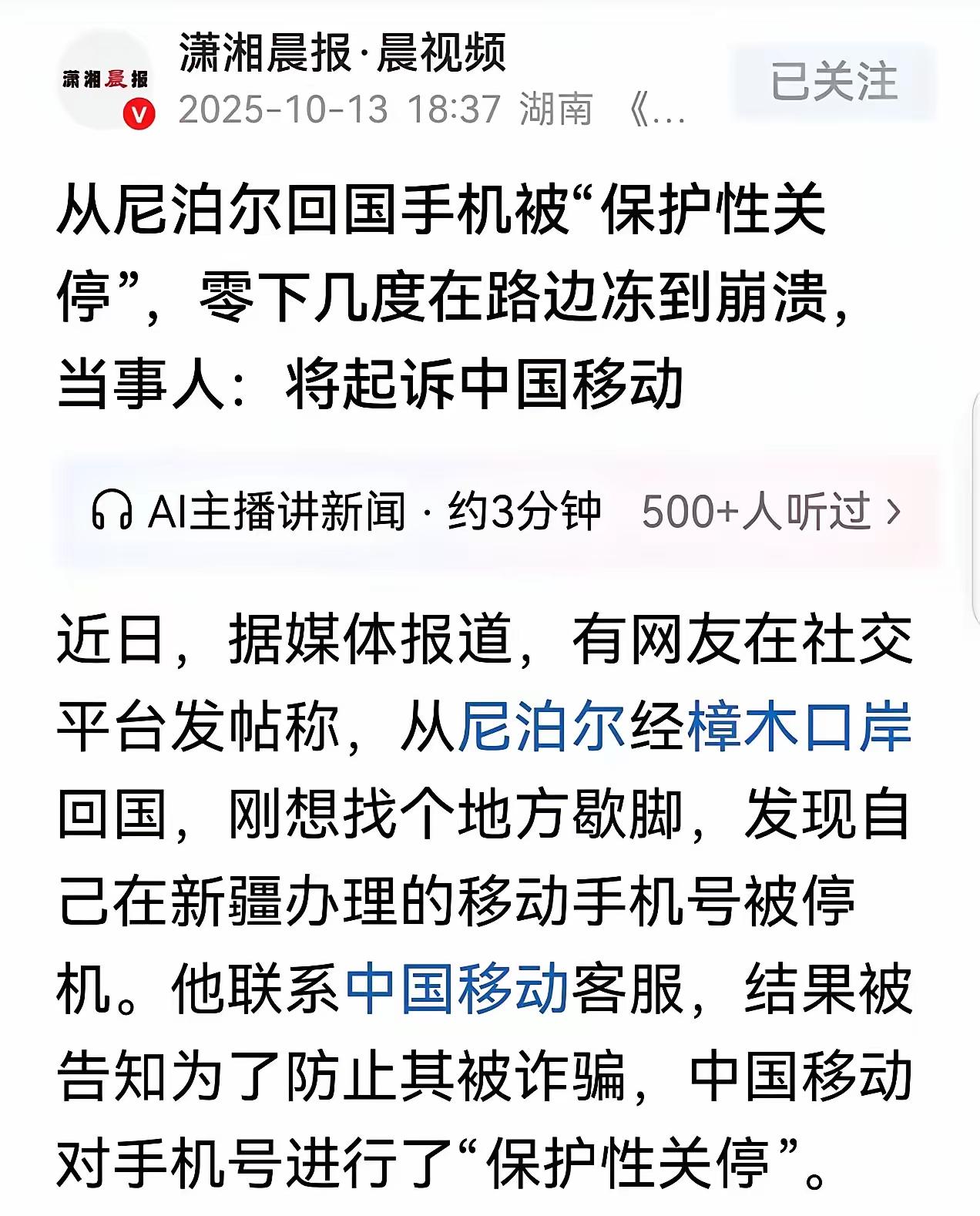 太离谱了!男子从尼泊尔回国,手机突然停机,他以为欠费就充了200元,可还是没有信号,于是联系移动客服,客服却说:为了防止你被诈骗,对你的手机号进行了“保护性关停”,想要开机必须去移动厅办理!男子:让我在零下几度,身无分文冻到崩溃! 太离谱了!男子从尼泊尔ICON回国,手机突然停机,他以为只是欠费,赶紧充了200元,心想着总算可以联系家人、报平安了。然而,令人震惊的事情接踵而至——手机还是没有信号!他拨打移动客服,期待着一番合理的解释,却迎来了一句令人愤怒的回答:“为了防止你被诈骗,我们对你的手机号进行了‘保护性关停’,你必须亲自去营业厅办理解封。” 这是什么逻辑?难道在这个信息化高速发展的时代,手机变成了“防骗工具”而非通讯工具?男子身无分文、身处零下几度的寒风中,竟然还要奔波到营业厅办理手续,难道这就是“科技进步”带来的“贴心服务”?试想一下,一个普通人,刚刚经历了长途飞行、跨越大半个地球的辛苦,回到家门口,却被一纸“保护令”挡在门外。这样的体验,谁能不愤怒?谁能不心碎? 更令人深思的是,这背后折射出的是我们社会对于“安全”的盲目追求。是的,防止诈骗固然重要,但难道就不能有更人性化、更便捷的解决方案?难道在这个信息爆炸、科技飞速发展的时代,我们的“安全措施”必须以牺牲普通民众的基本权益为代价?难道就不能在保障安全的同时,考虑一下普通人的感受和实际困难? 这件事,或许只是冰山一角,但它折射出的是一个普遍存在的问题——在追求“安全”的名义下,我们是否丧失了对人性的关怀?我们是否变得越来越冷漠、越来越机械?每一个普通人都可能在某个瞬间,成为“被保护”的对象,却也可能变成“被困”的受害者。 所以,读到这里,你是否也在心里暗暗吐槽:这到底是科技的进步,还是社会的倒退?我们需要的,是一种更智慧、更有人情味的管理方式,而不是冷冰冰的“保护措施”。我们希望,未来的每一次科技创新,都是为了让生活更便捷、更温暖,而不是让人们在寒风中瑟瑟发抖、无助挣扎。 这件事情,值得我们每一个人深思:在追求安全的同时,我们是否也在无形中剥夺了人们的尊严和自由?让我们一起呼吁,科技应成为温暖的力量,而不是冷漠的枷锁。毕竟,生活本该简单而美好,不是吗?移动欠费陷阱 尼泊尔封禁微信