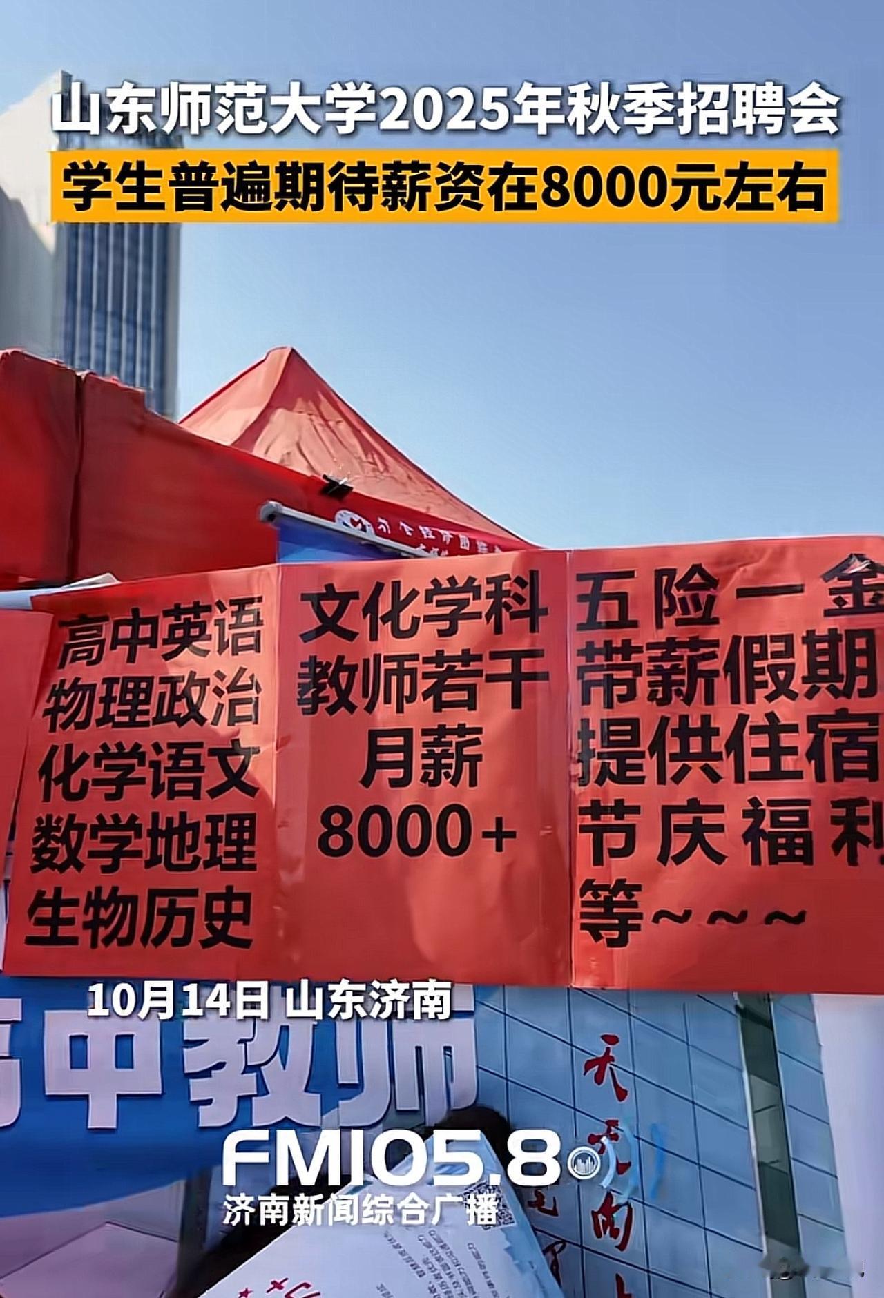 “绝绝子!”山东师范大学2025秋季招聘会,发现学生普遍期望薪资在8000元左右,觉得这样才能维持基本的开支,引发热议。 针对此情况,有网友说,这帮年轻人是不是都不接触社会,我工作19年,济南市区区属公立初中,一级,干着班主任,一个月到手才9000左右。 也有网友坦言,我一个工作22年的高中高级职称的老教师才8000多,这些初出茅庐的学弟学妹们真敢想。想高收入,别当老师。 还有网友表示,我表妹大学辅导员,工作十多年了,也才九千多,这些孩子真的以为钱好挣啊。 那么问题来了,山东师范大学这些刚毕业的大学生,要求期望8000元的薪资,真的过分吗?#寻美三湘# #长沙新朋友#