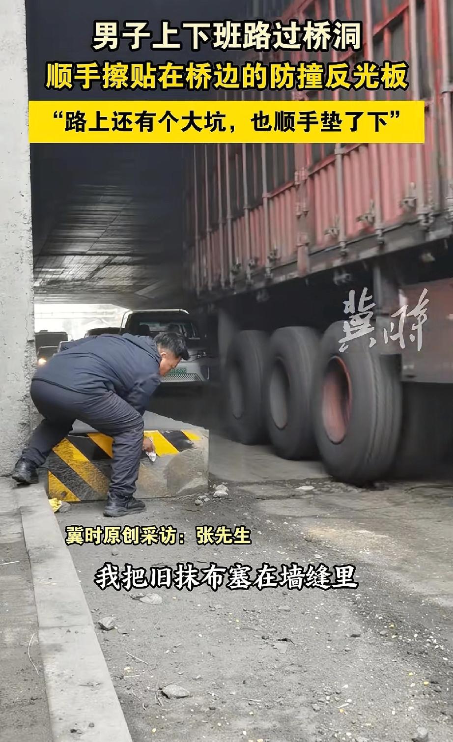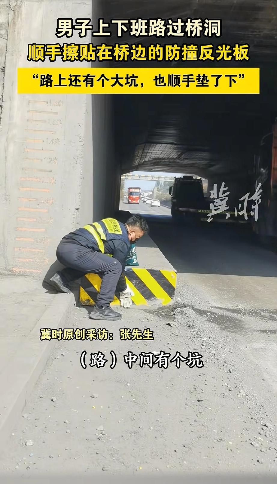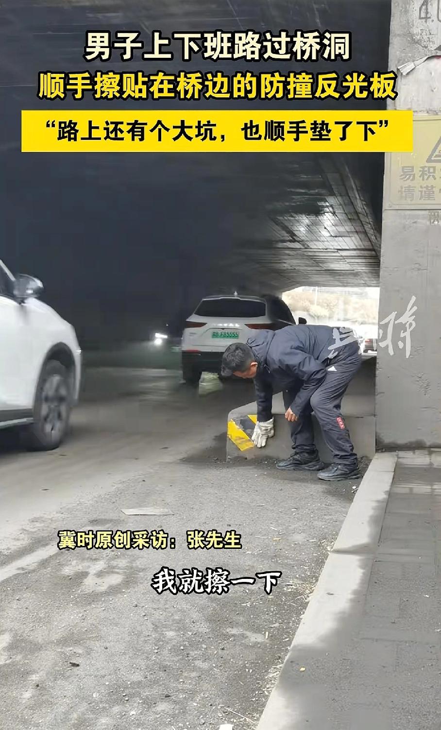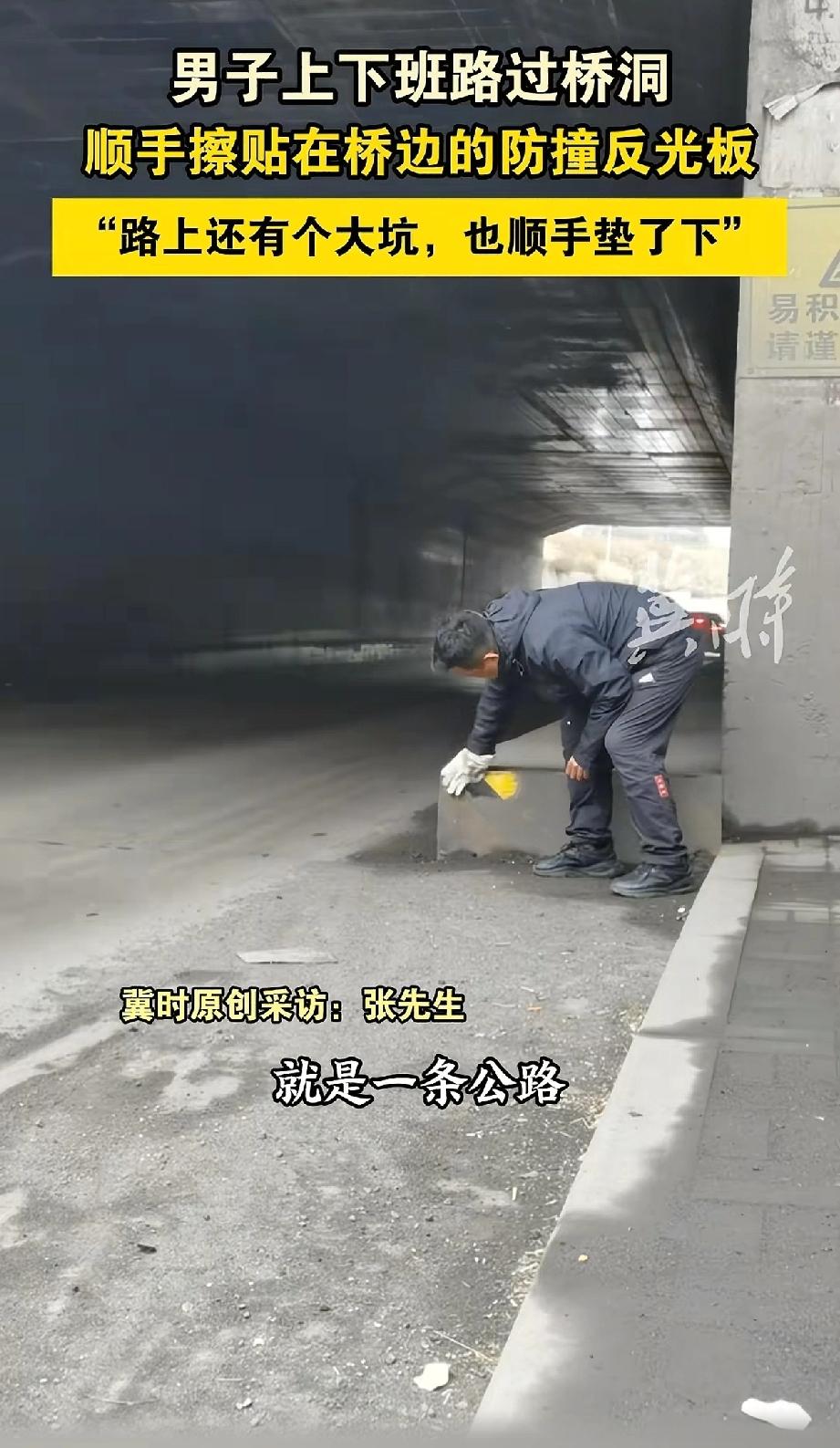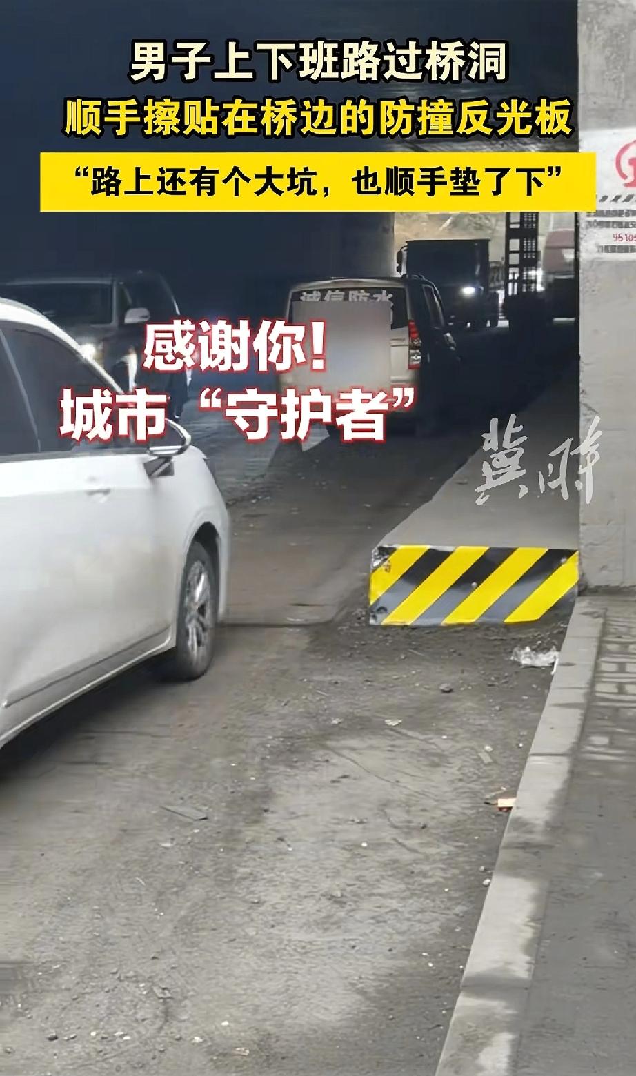 “太暖心了吧!”内蒙古包头的张大哥由于每天下班回家都会经过一个桥洞。结果他在这个桥洞下面做了一件令人想不到的事情。 张大哥下班回家都会经过一个桥洞。桥洞的两边有一个厚厚的大台阶,保护桥洞的柱子。由于这个台阶突出一截,为了安全起见,台阶的侧面被贴上了反光条。 连日来的阴雨天气,将这条路冲刷的有些泥泞。那些泥土被经过的车辆溅到了反光条上,反光条被遮的完全看不出来。 张大哥义无反顾的将反光条擦了出来,而且光亮如新。这样过往的车辆就能够注意到这个台阶了,避免发生意外。张大哥还顺便把道路不平的地方给铺平了。 此事被传到网上也引起网友们的热议,有网友说:“看着外面虽破败不堪,但总有善良的人缝缝补补。” 也有网友说:“是路政的事,只需要向路政举报就行了,虽然你是善举但这不是正确的处理方式。” 感谢张大哥的善举,他的这一举动完全避免了事故的发生。尤其这里面没有路灯,过往的车辆很容易被撞上去。 真的被张大哥的举动感动了,给张大哥点赞,好人一生平安!